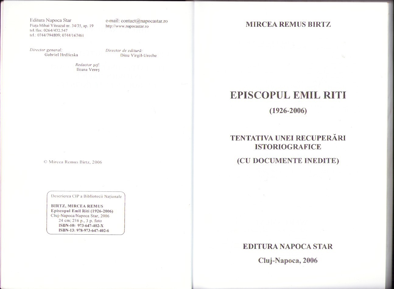 Episcopul Emil Riti 1926-2006, tentativa unei recuperări istoriografice, cu documente inedite de Mircea Remus Birtz, 2006.