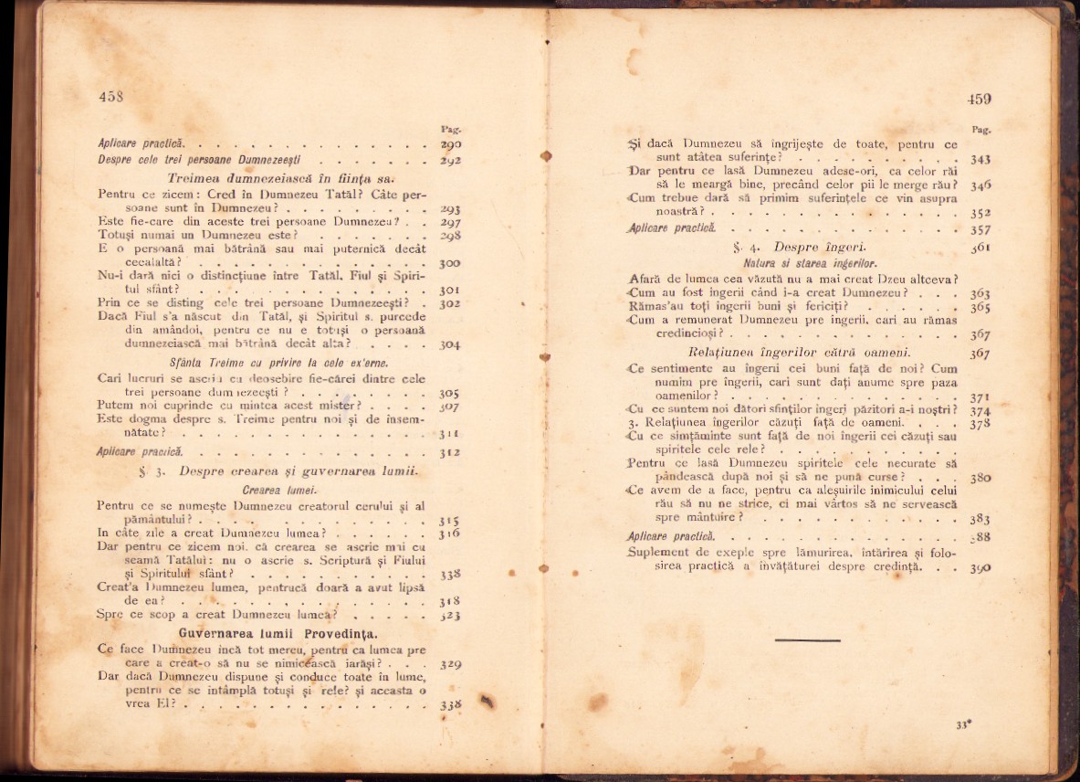 Explicarea cu temeiu și ușor de priceput a catehismului catolic însoțită de exemple acomodate și alese, ca carte ajutătoare la instruarea catehetică în școală și în biserică și ca carte de cetit pentru familiile creștine de Josif Deharbe preot DSI, tomul I, prelucrată după edițiunea a doua de membrii Societății bis-literare a teologilor români din Viena coreasă și retipărită după edițiunea a V-a de membrii Societății bis-lit Alexi Șincai cu aprobarea Veneratului Ordinariat, Gherla, 1908.