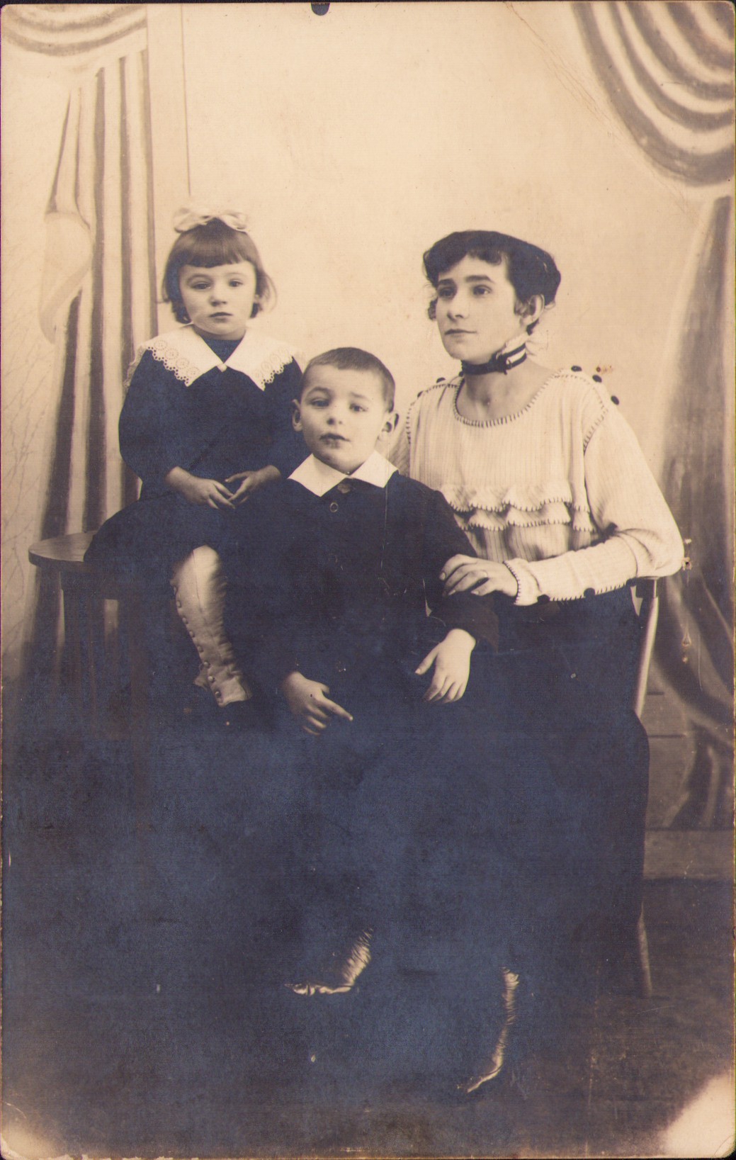 Pe spatele fotografiei cei doi copii și soția îi scriu în limba maghiară voluntarului pe timp de 1 an Muszták Imre.