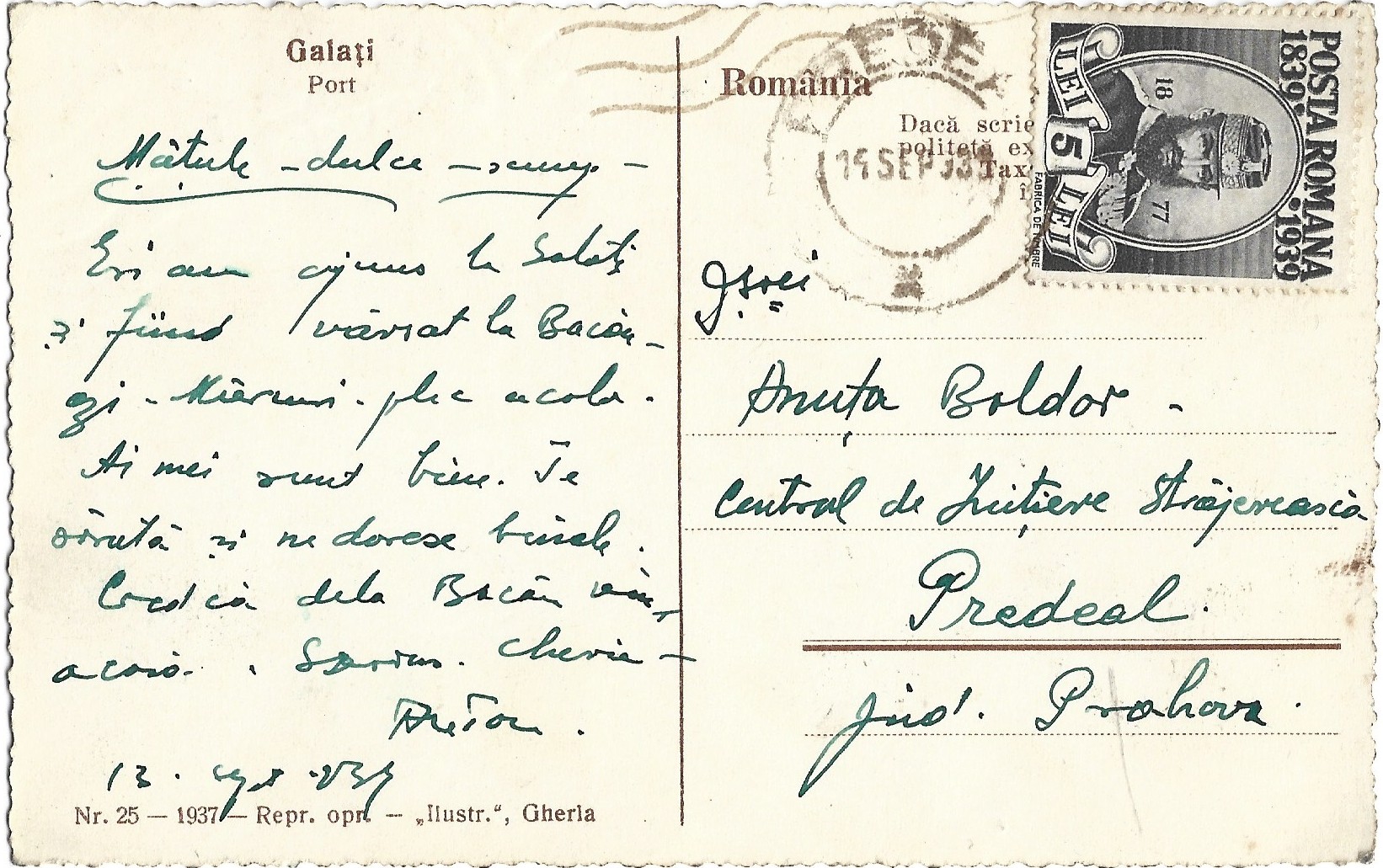 Galați, port, carte poștală circulată Predeal, tipărită la editură din Gherla, 1937.