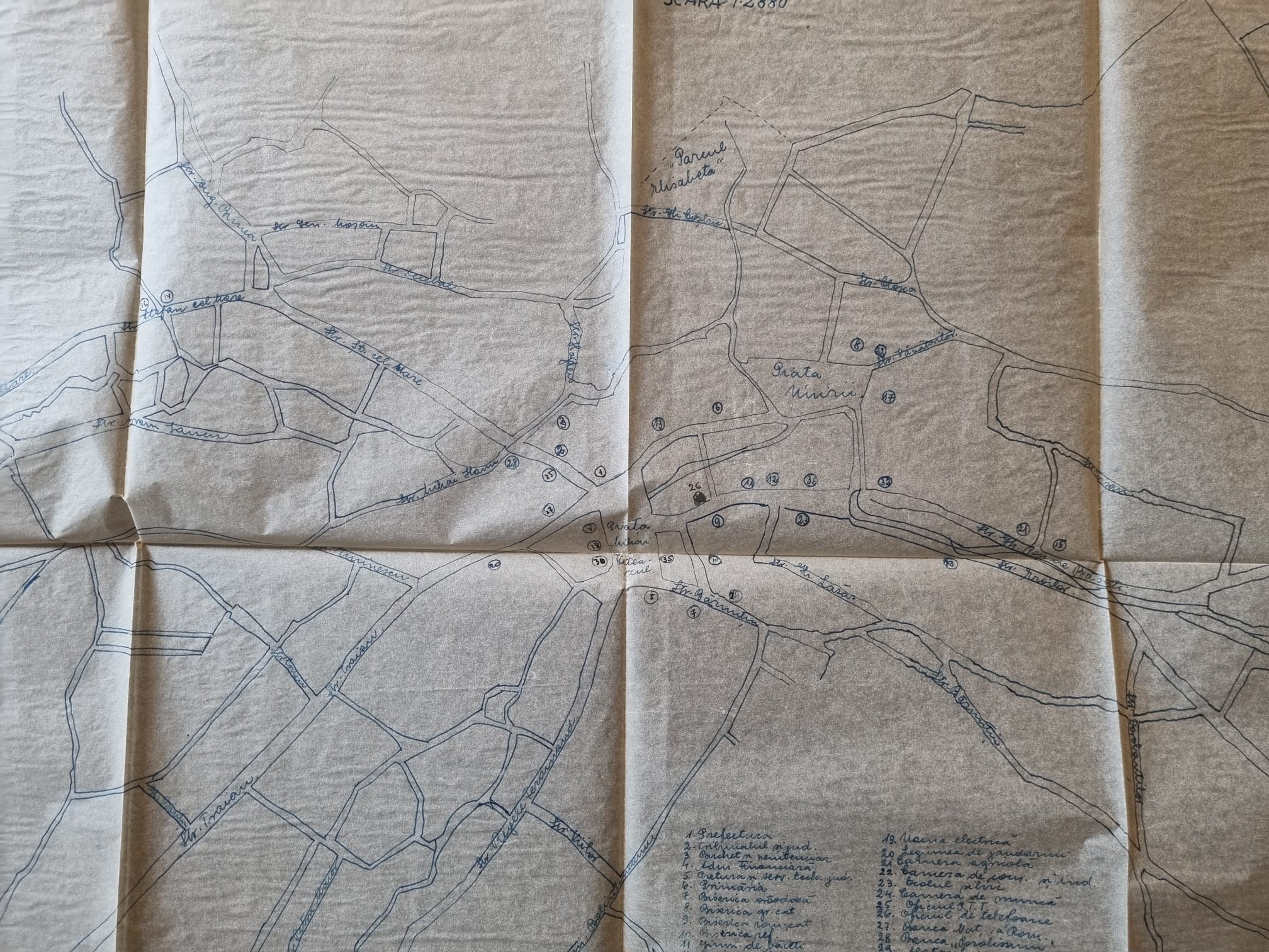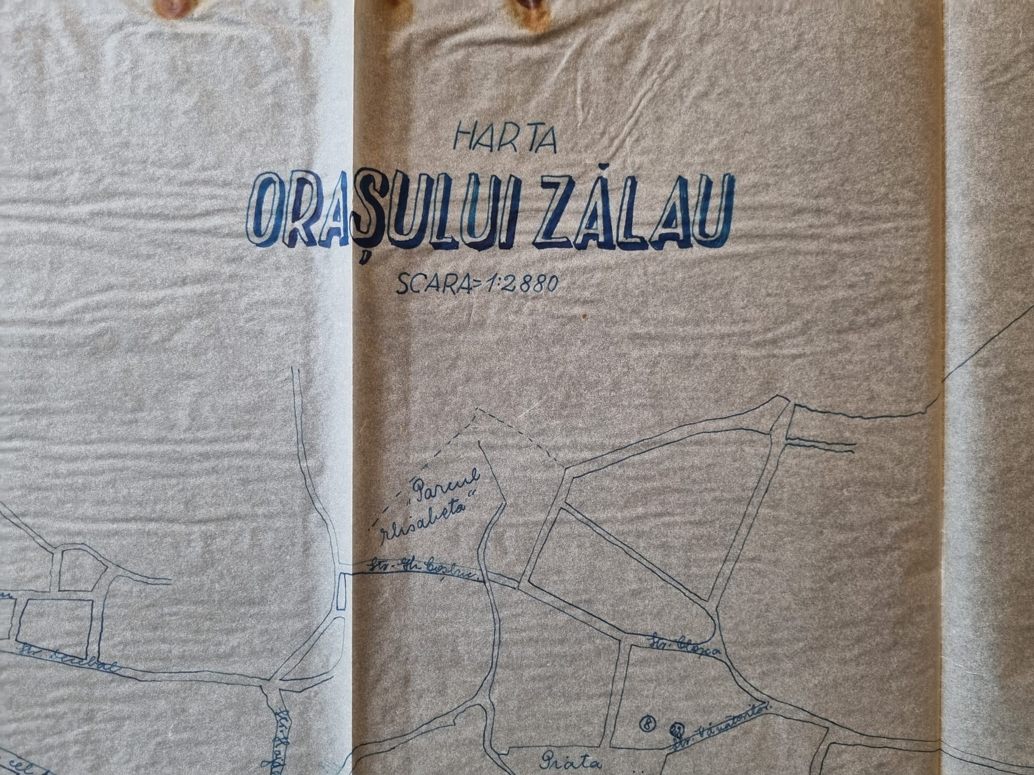 Harta orașului Zalău desenată de mână pe hârtie de calc, 1940.