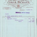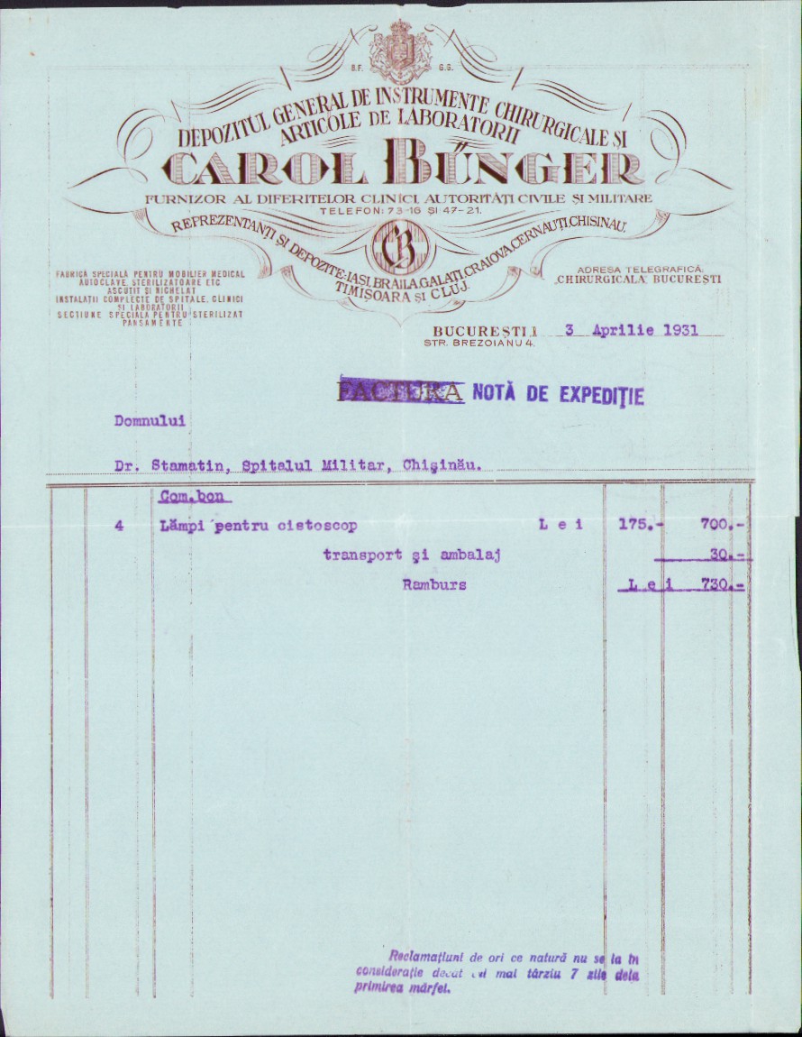 Hârtie cu antet finisat cu lac selectiv, 1931, Depozitul general de instrumente chirurgicale și articole de laboratorii Carol Bűnger, furnizor al diferitelor clinici, autorități civile și militare, reprezentanți și depozite Iași, Brăila, Galați, Craiova, Cernăuți, Chișinău, Timișoara și Cluj.