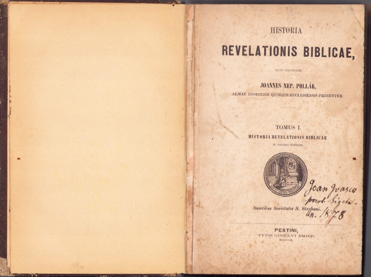 Historia revelationis biblicae quam concinnavit Joannes Nep Pollák, 1859, Pesta, cu semnătura olografă a preotului greco-catolic Ioan Ivașcu, paroh în Sighet, 1878.