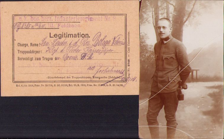 Legitimație, 1918, pentru Signum Laudis – Bronzene Militär-Verdienstmedaille am Bande der Tapferkeitsmedaille cu ștampila k.u.k. Bosnisch-herzegowinische Infanterieregiment Nr. 8 în care a servit pe frontul italian ca medic militar Valeriu Lucian Bologa, nepot de frate al revoluționarului pașoptist Iacob Bologa și fotografia sa în uniformă austro-ungară. Ulterior voluntar în Legiunea Română din Italia în Regimentul 2 „Cloșca”, va urma la Cluj o carieră medicală și universitară, devenind părintele istoriei medicinii românești.