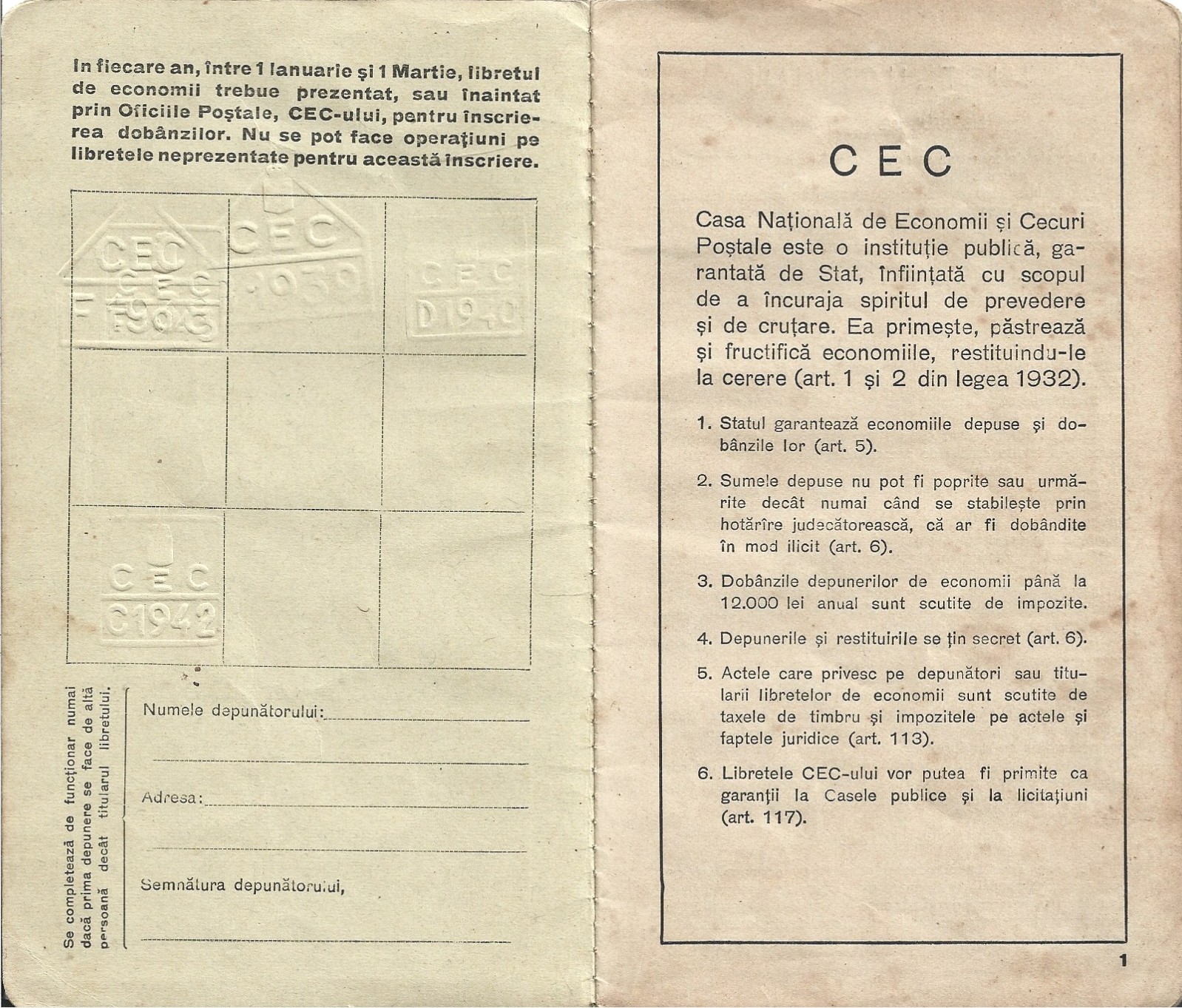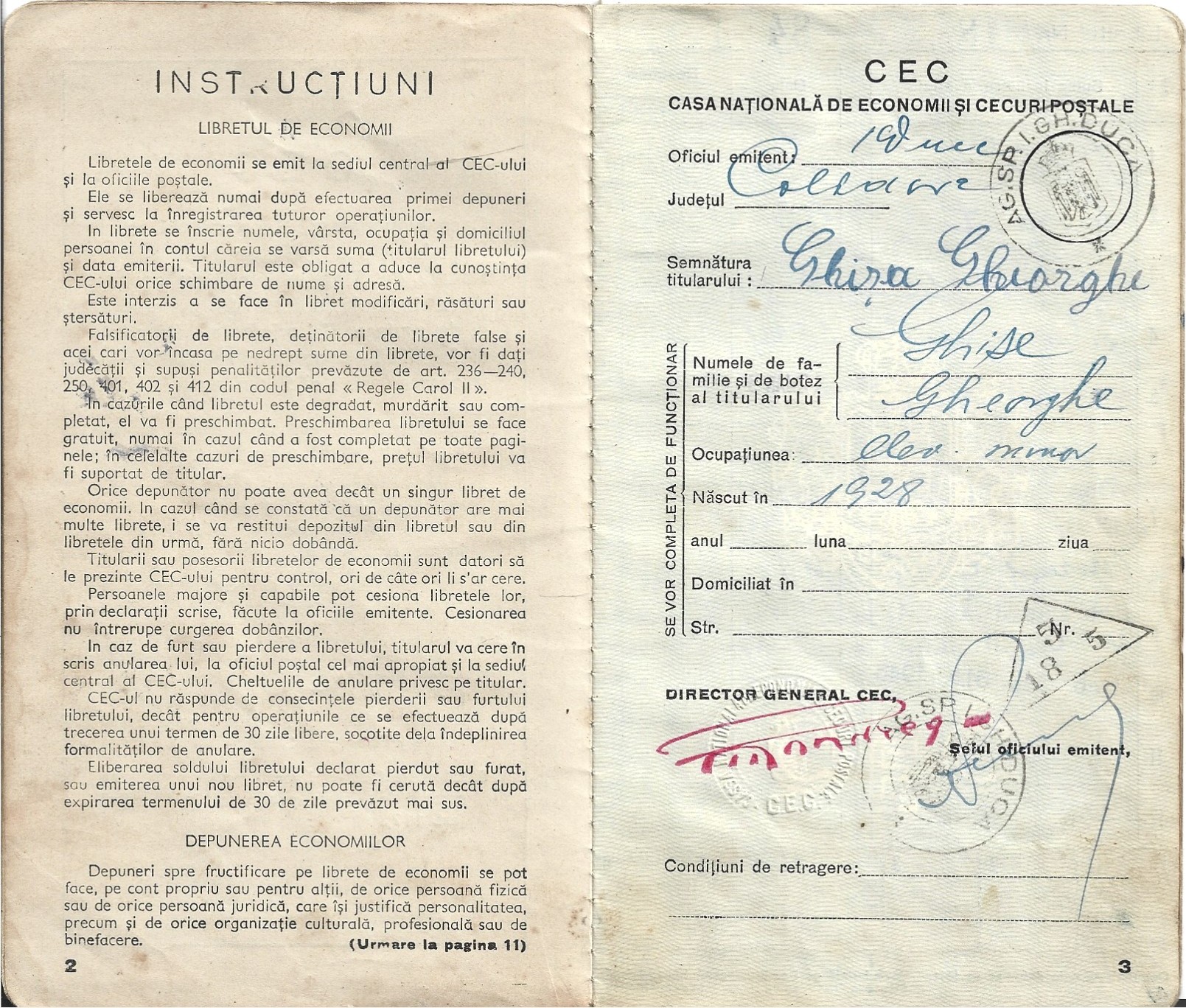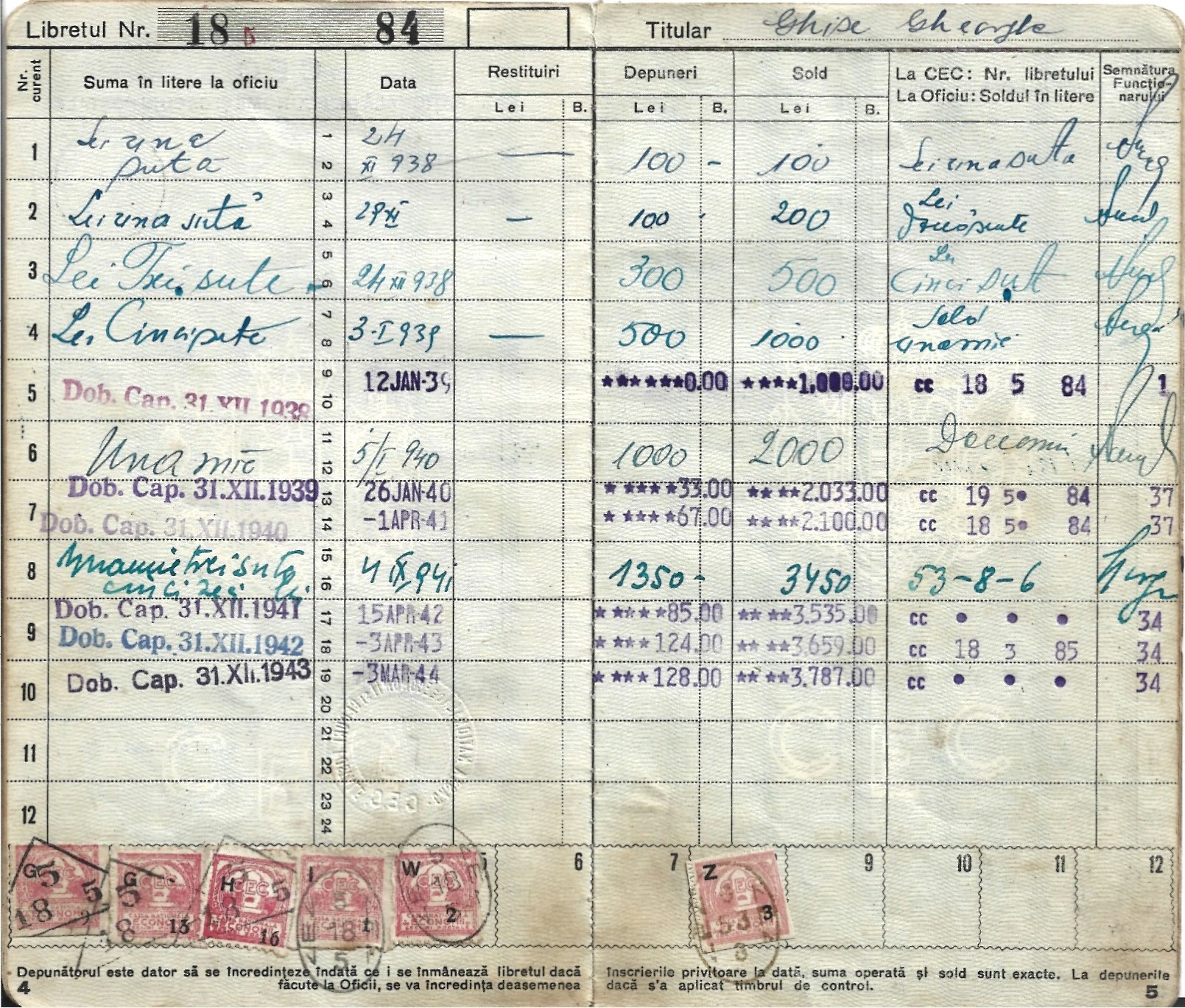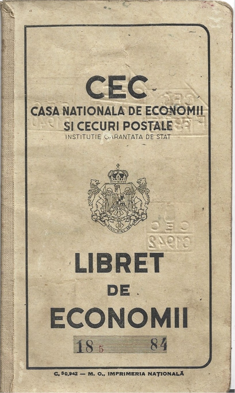 Libret de economii CEC, Agenția Specială I G Duca, județul Caliacra, Cadrilater, 1938.