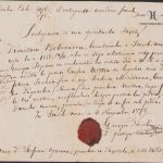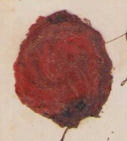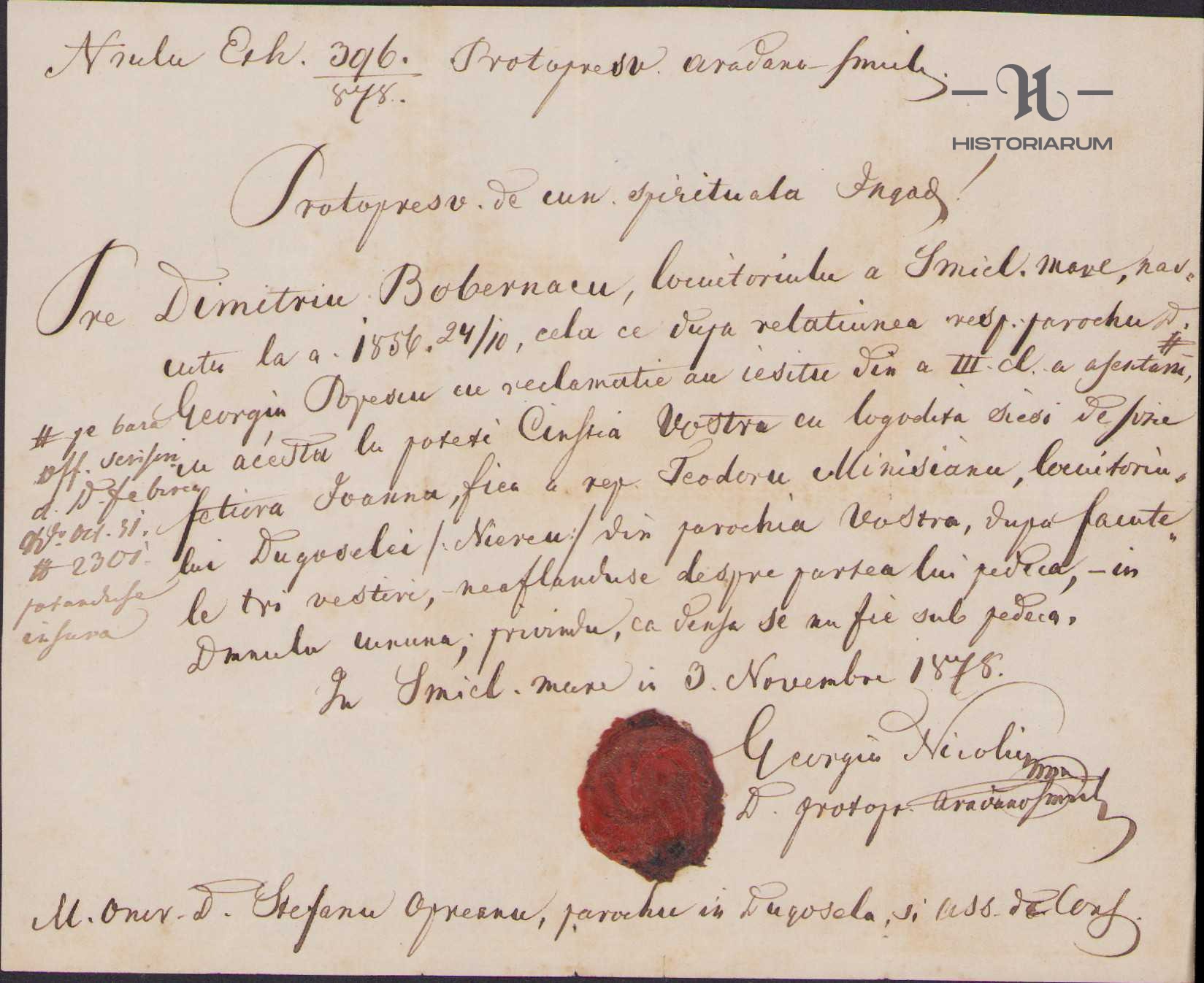 Licență de căsătorie eliberată de protopopul ortodox George Nicolin al localității Sânnicolau Mare, azi în județul Timiș, 1878. Sigiliul personal al protopopului este aplicat în ceară roșie pe document, bine vizibil.