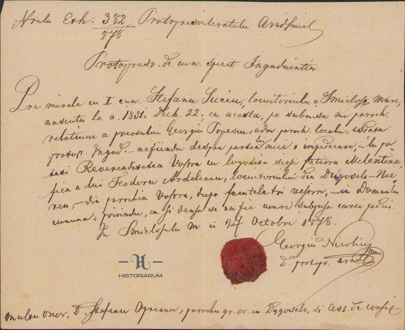 Licență de căsătorie eliberată de protopopul ortodox George Nicolin al localității Sânnicolau Mare, azi în județul Timiș, 1878.