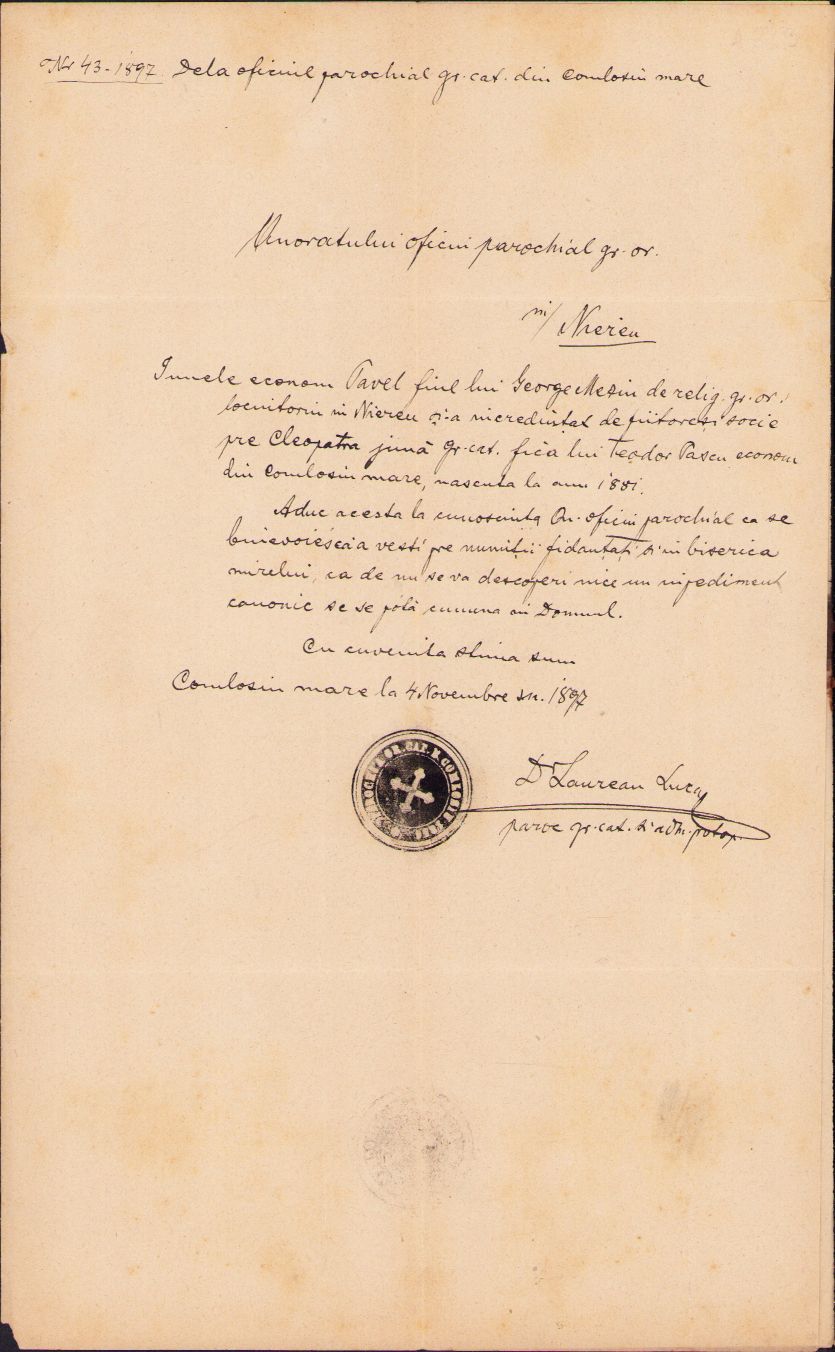 Licență greco-catolică de căsătorie, 1897, Comloșu Mare, județul Timiș, scrisă și semnată manu propria de Laurean Luca, protopop al Aradului.