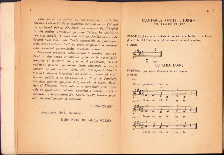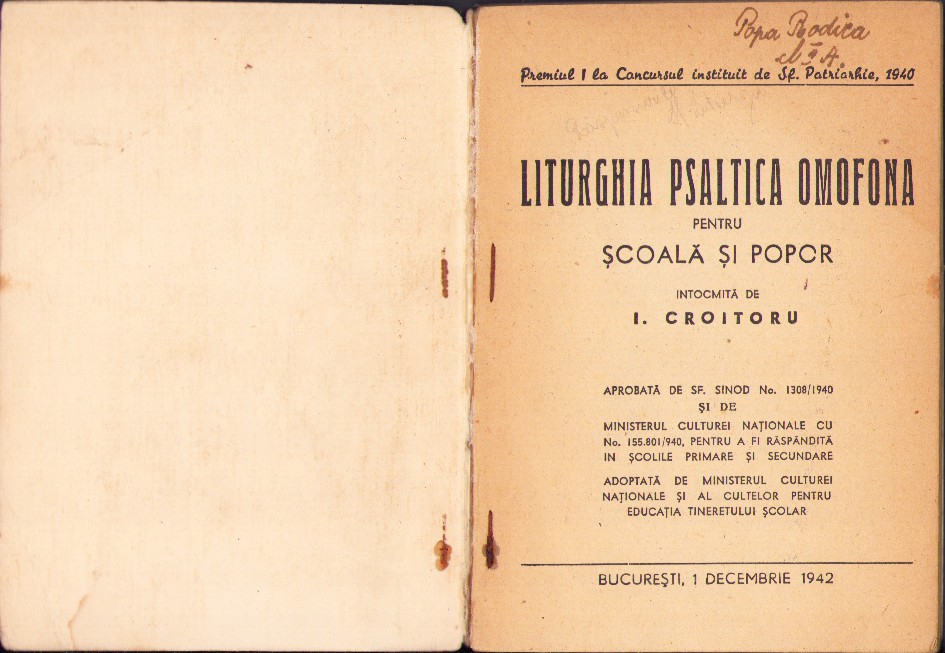 Liturghia psaltică omofonă pentru școală și popor întocmită de I Croitoru, 1942, aprobată de Sfântul Sinod, Premiul I la Concursul instituit de Sf Patriarhie, 1940, București