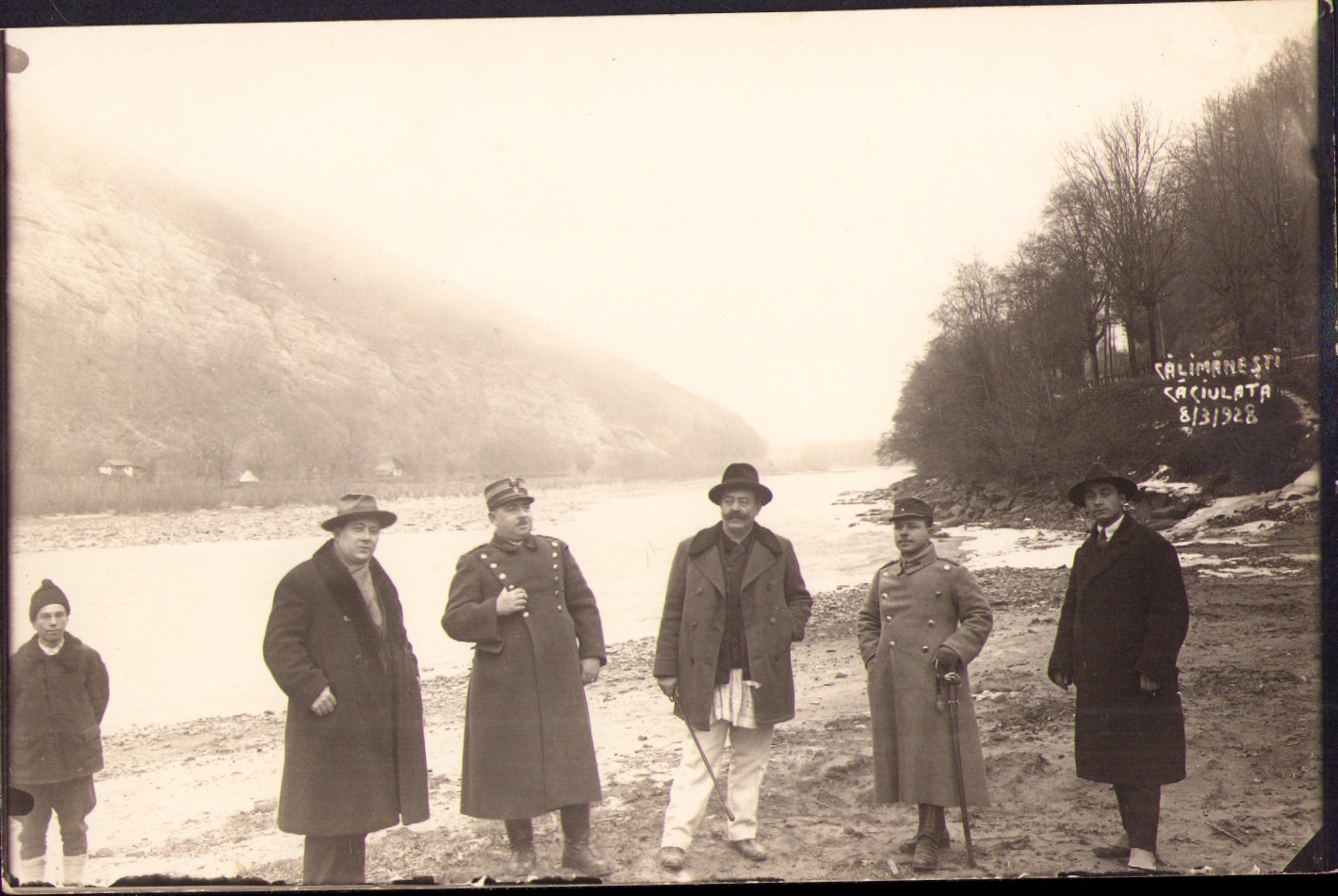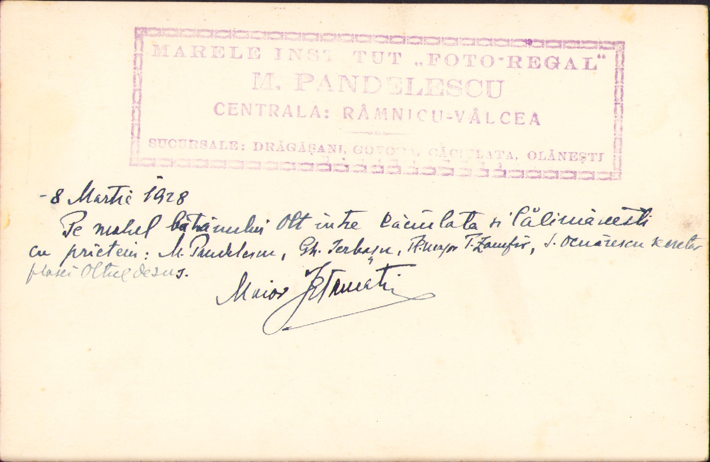 „8 Martie 1928. Pe malul bătrânului Olt între Căciulata și Călimănești cu prieteni: M. Pandelescu, Gh. Ierbașu, T.R. major T. Zamfir, S. Ocnărescu secretar plasei Oltul de Sus. Maior Stamatiu”. Fotografie studio Marele Institut „Foto-Regal” M. Pandelescu, Râmnicu Vâlcea.