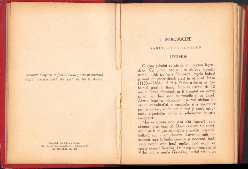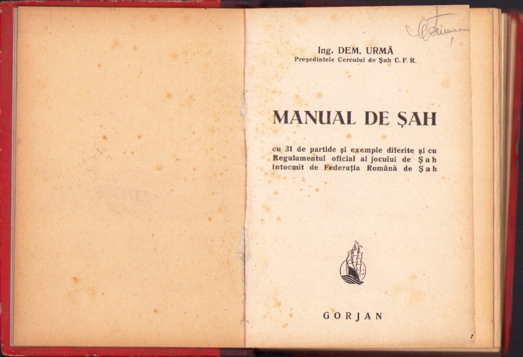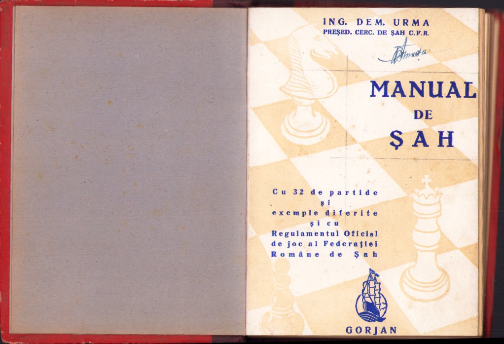 Manual de șah cu 32 de partide și exemple diferite și cu Regulamentul Oficial de joc al Federației Române de Șah de Dem Urma, 1945.