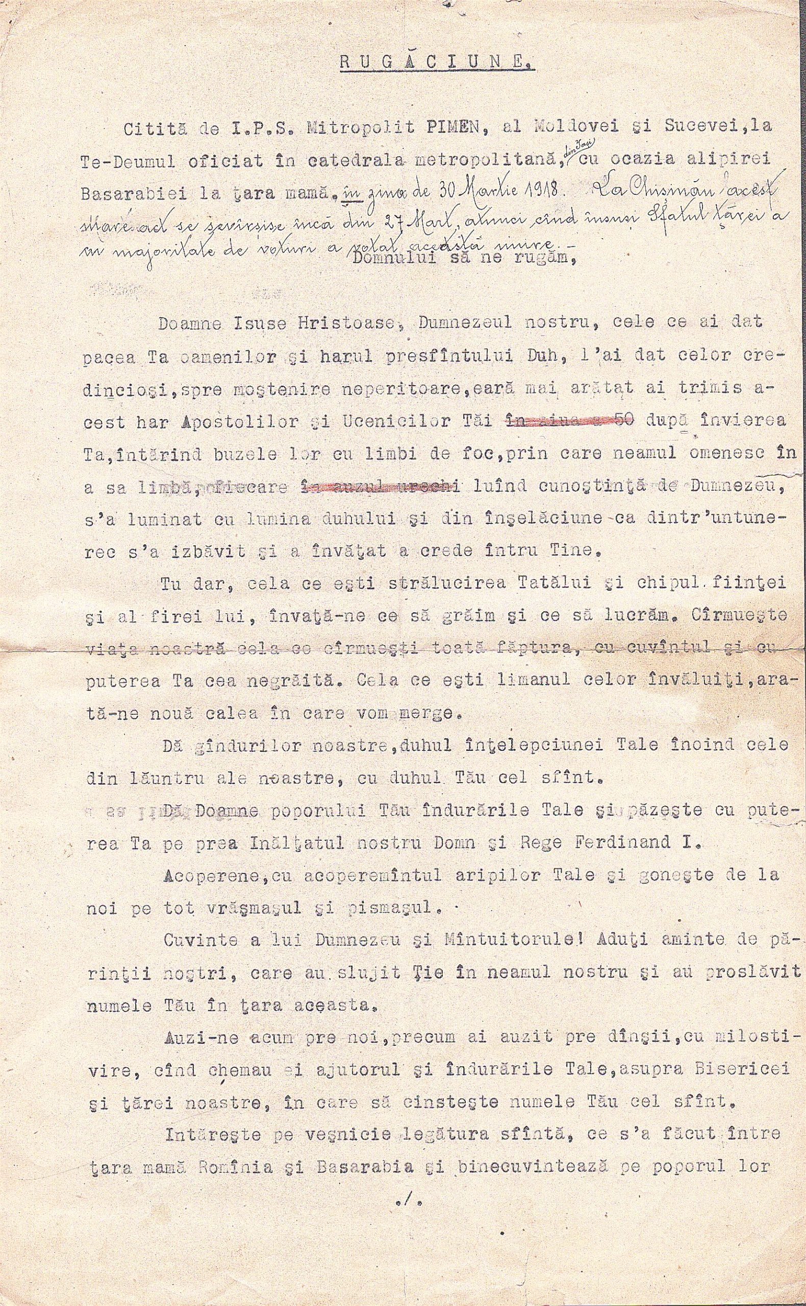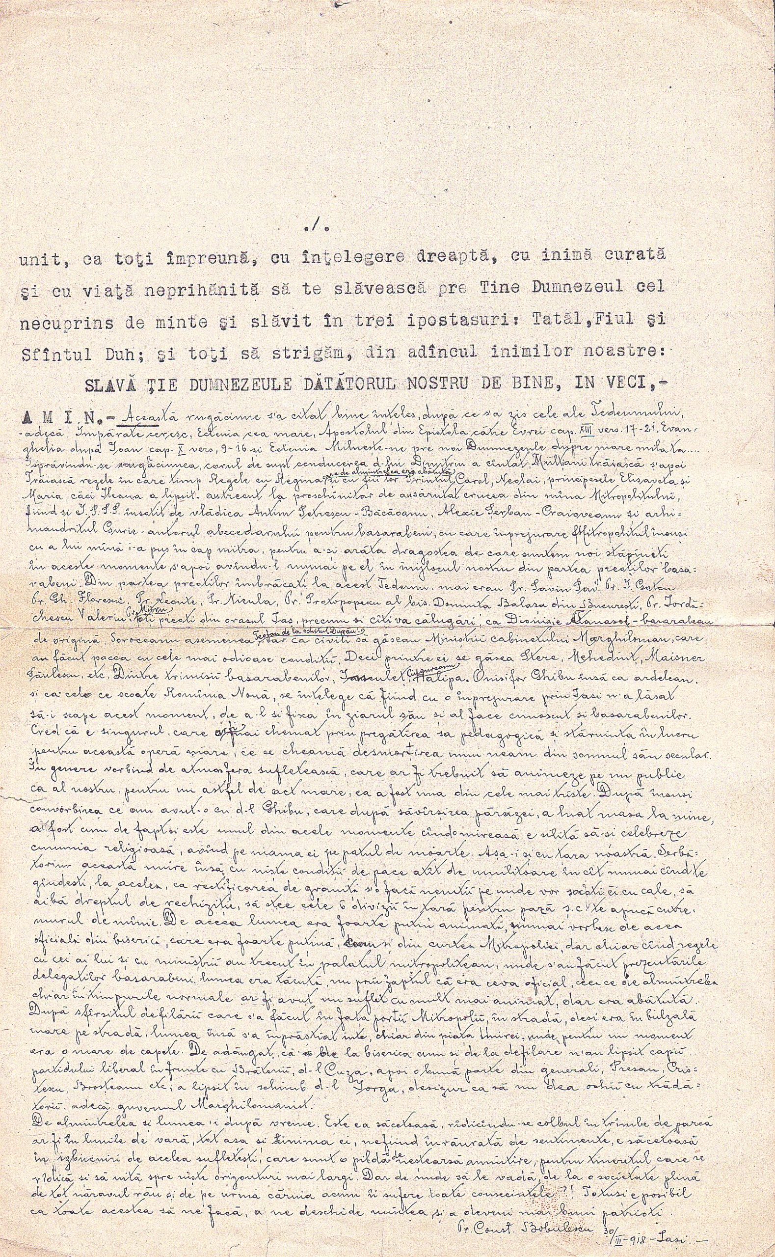 Martorul ocular este preotul Constantin Bobulescu din Iași, care descrie ce a văzut la sărbătorirea Unirii Basarabiei cu Bucovina la 30 martie 1918 la Iași. Documentul începe cu rugăciunea citită de Î.P.S.S. Mitropolit Pimen al Moldovei și Sucevei în catedrala mitropolitană din Iași, scrisă la mașină, cu o notă olografă a lui C-tin Bobulescu. Se continuă pe pagina 2 cu mărturia olografă a acestuia, care grăiește astfel (am păstrat nealterat modul de scriere al autorului):
