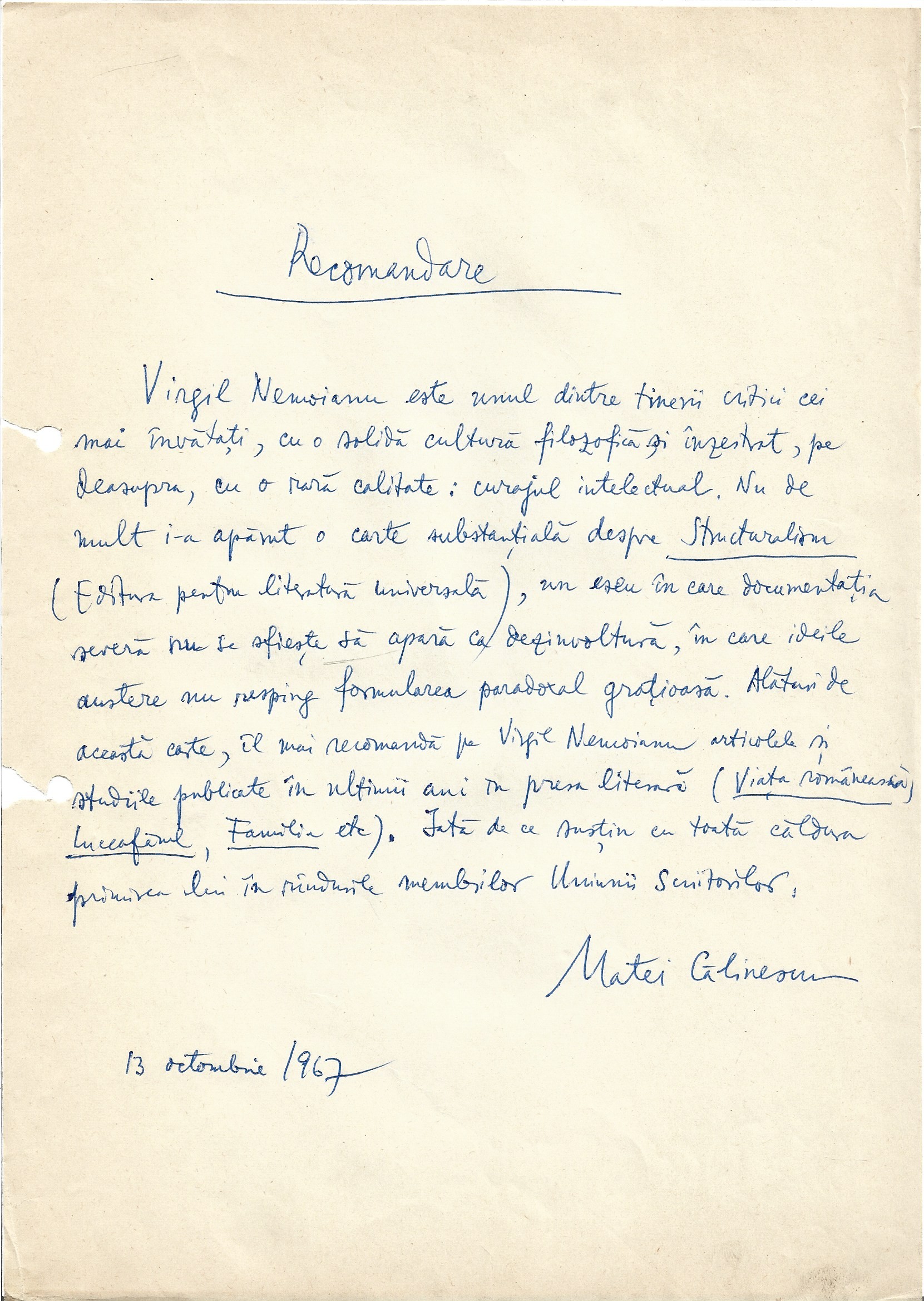 Matei Călinescu, act scris și semnat olograf, 1967.