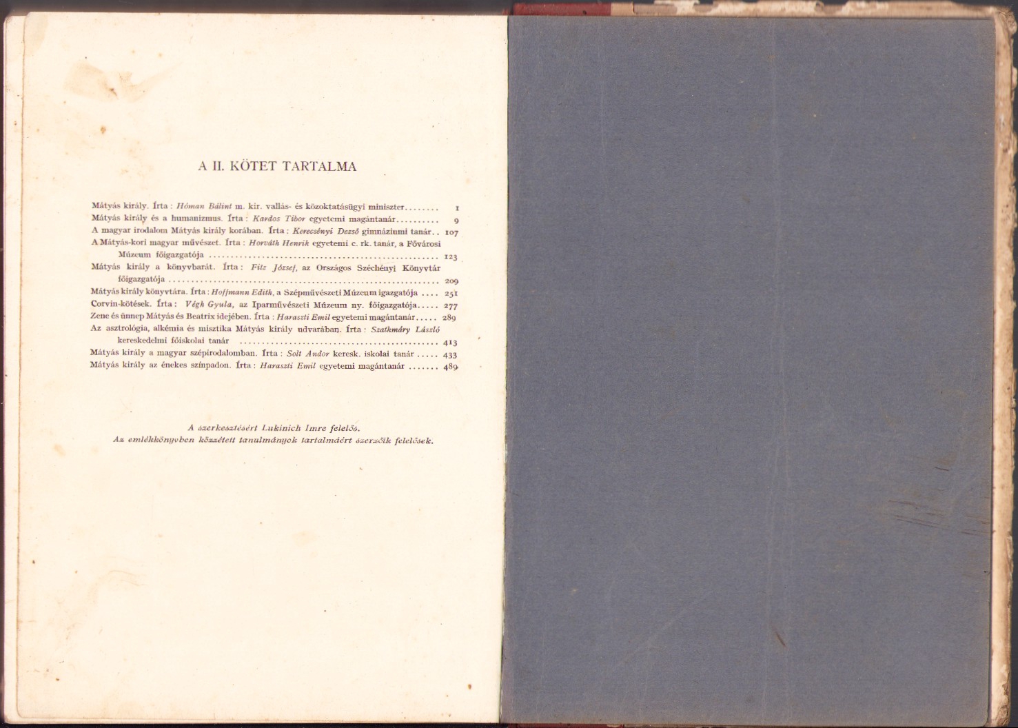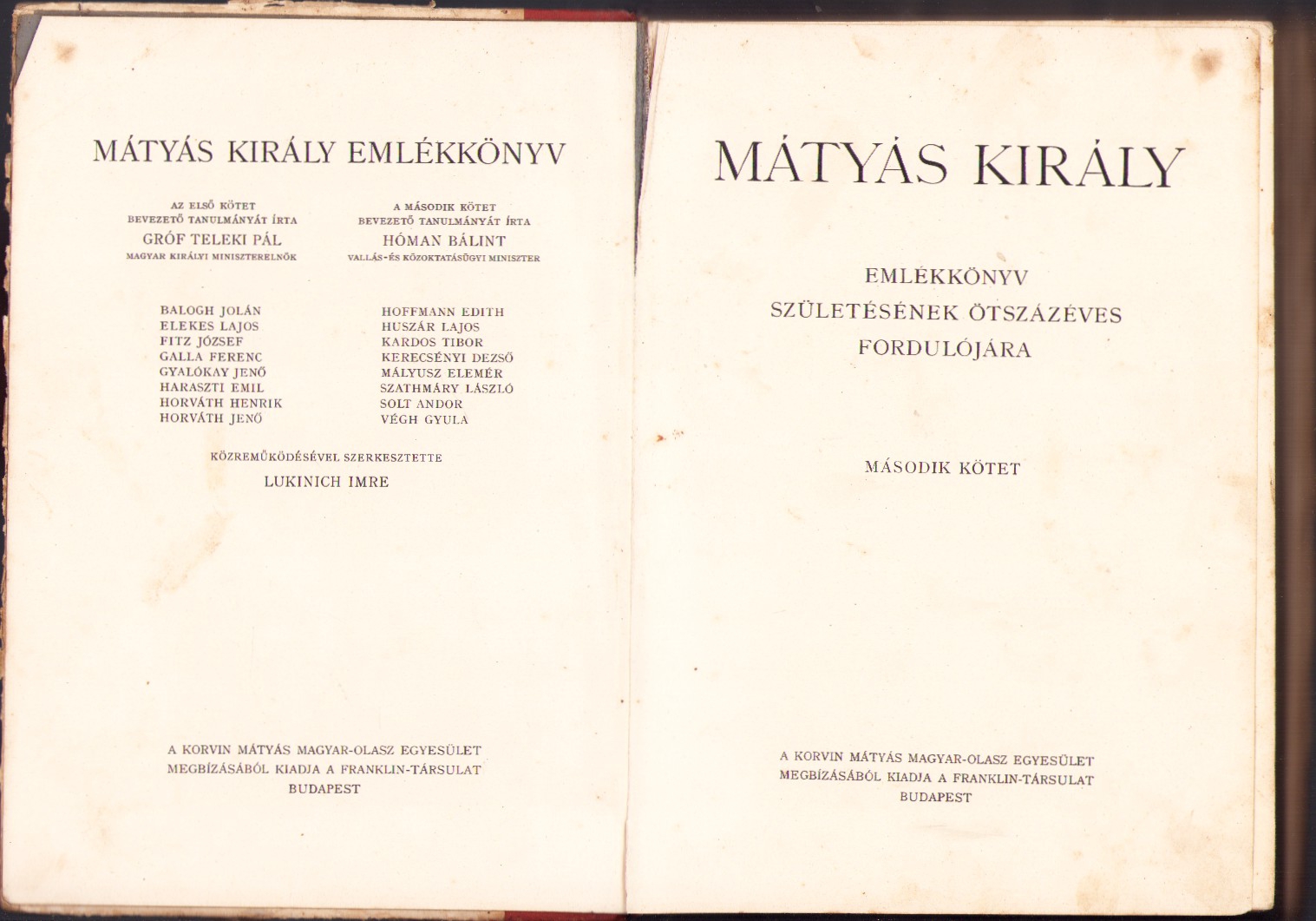 Mátyas Király emlékkönyv születésének ötszazéeves fordulójára, második kötét, 1940, Budapest.