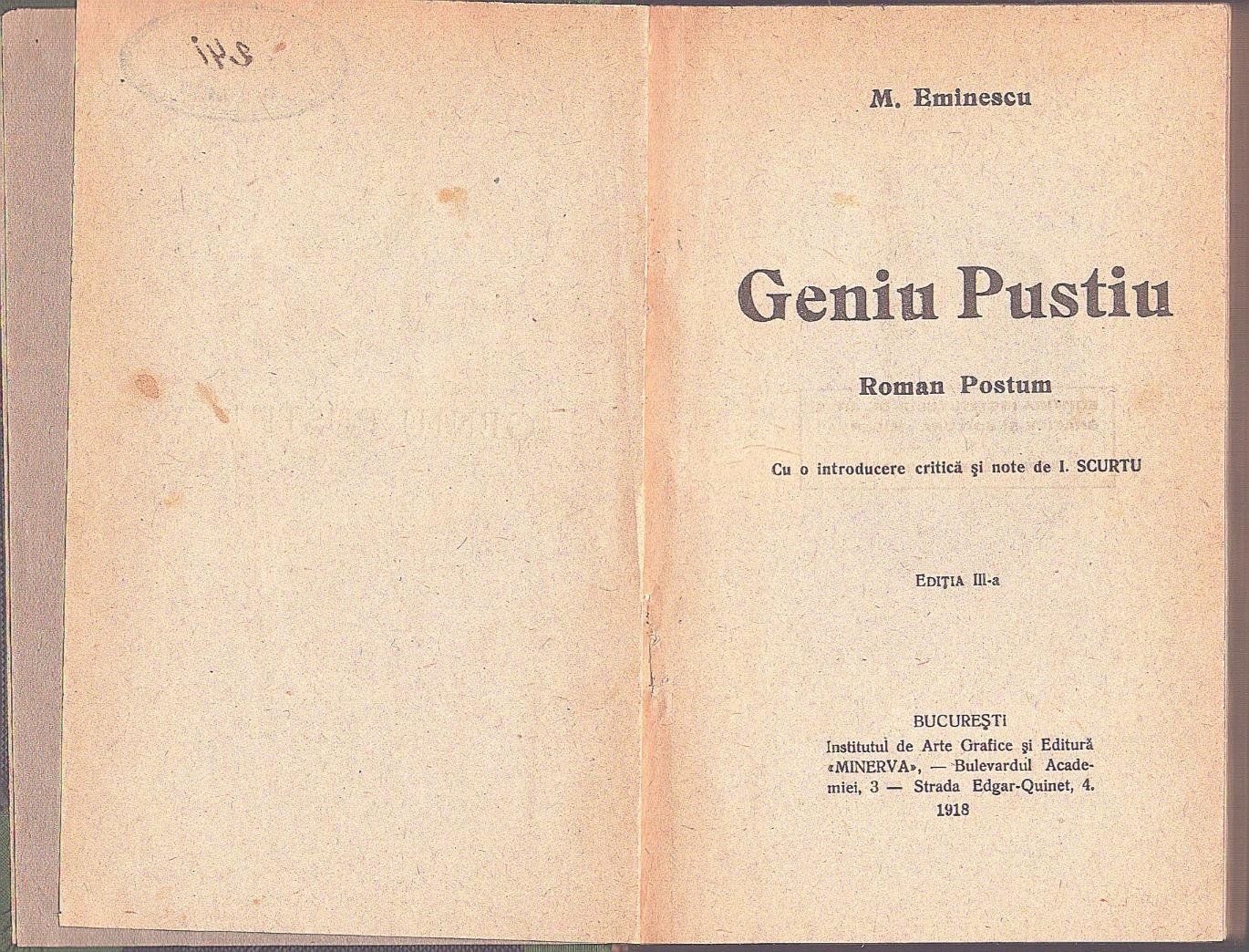 Mihai Eminescu, Geniu pustiu, roman postum cu o introducere critică și note de I Scurtu, 1918.