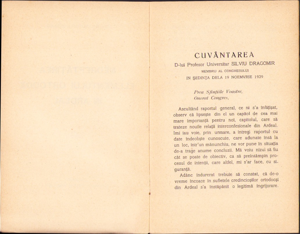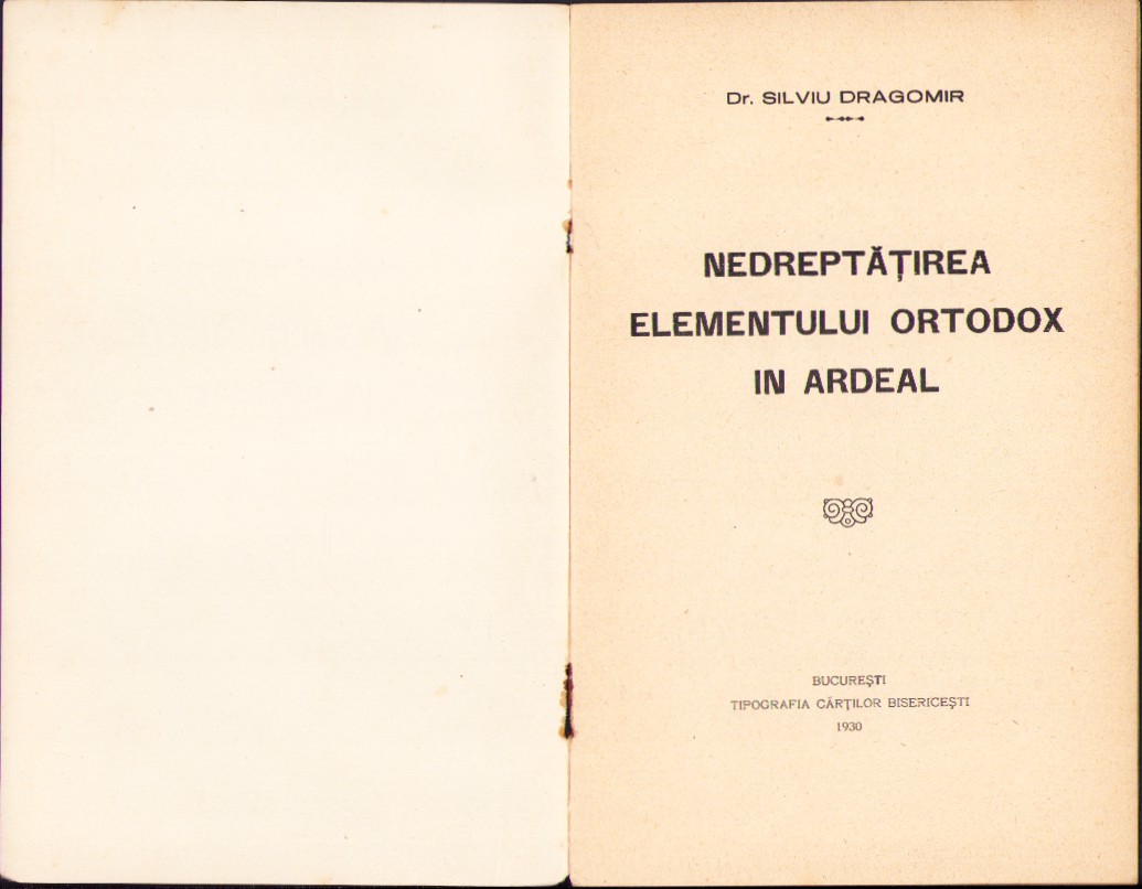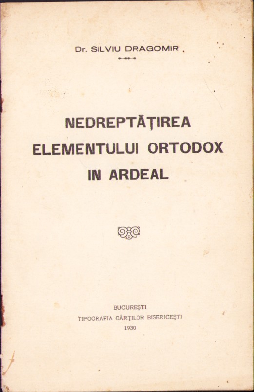 Nedreptățirea elementului ortodox în Ardeal de Silviu Dragomir, 1930, Tipografia Cărților Bisericești, București.