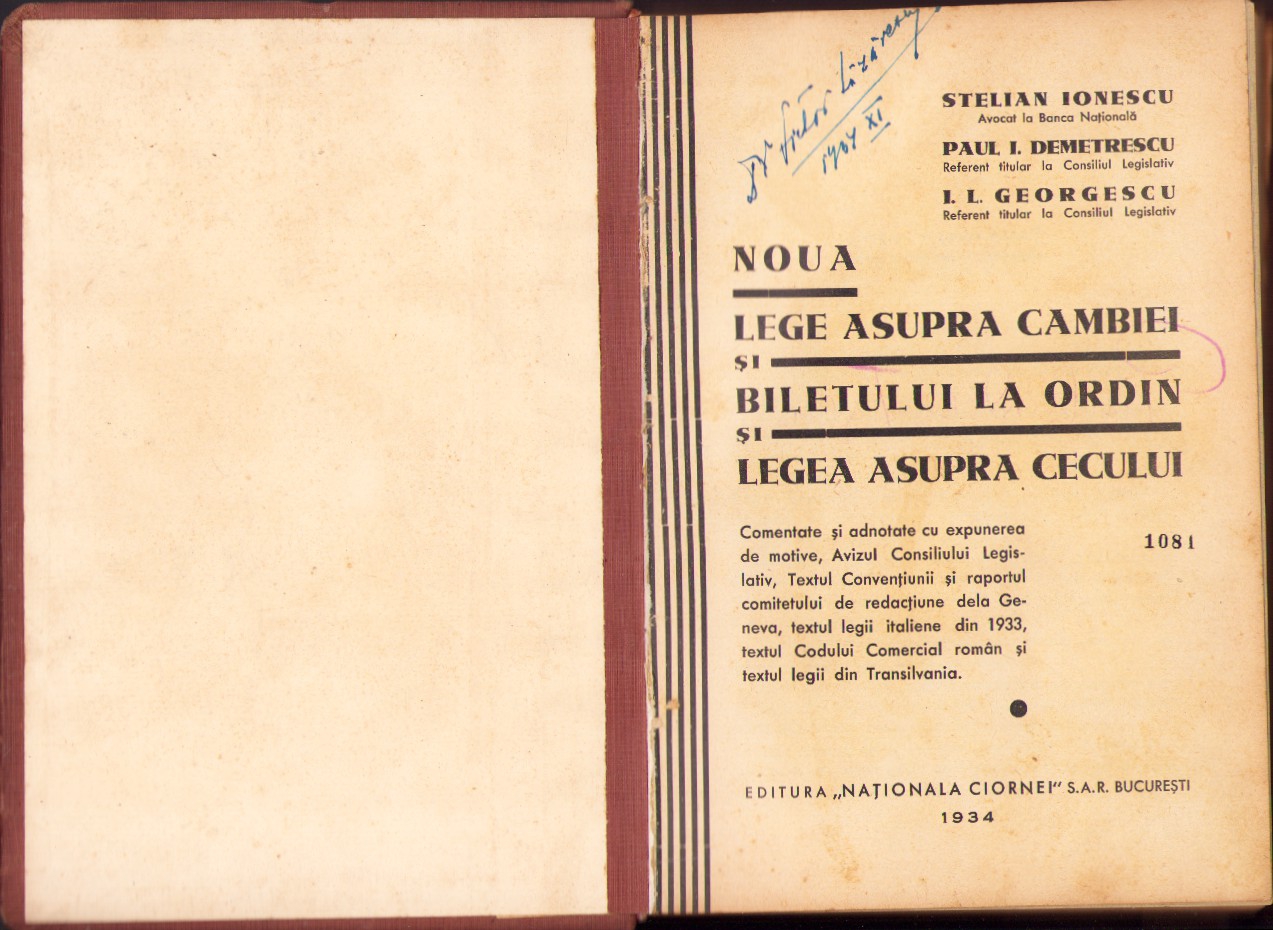 Noua lege asupra cambiei și biletului la ordin și legea asupra cecului de Stelian Ionescu, Paul Demetrescu și I. L. Georgescu.