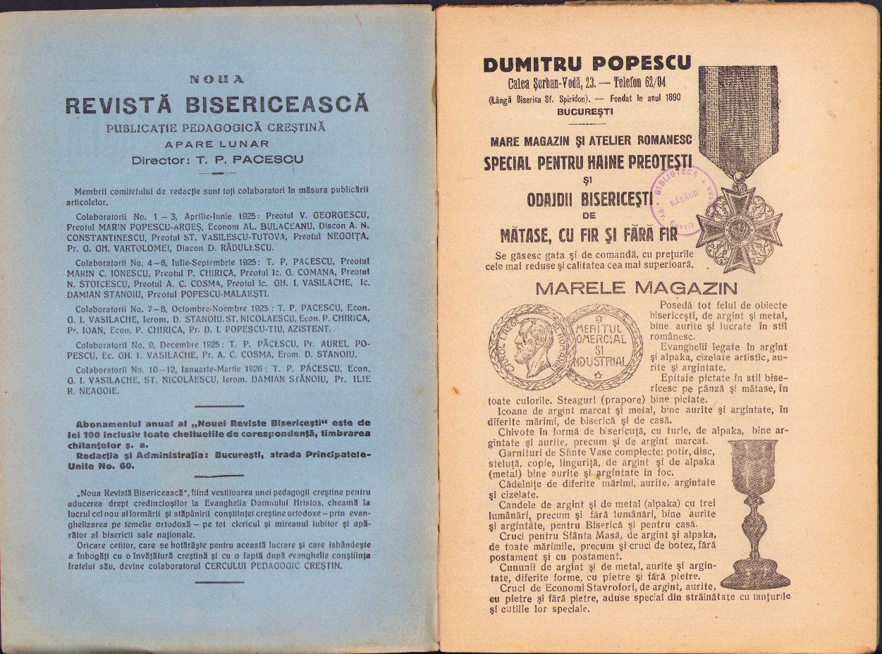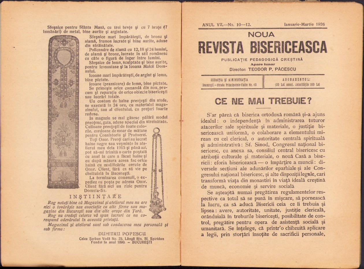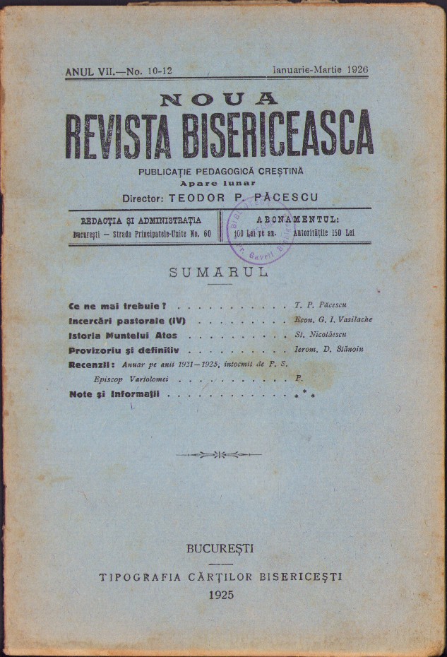 Noua Revistă Bisericească, 10-12/1926, Tipografia cărților bisericești, București
