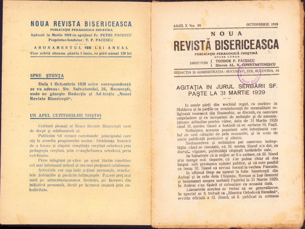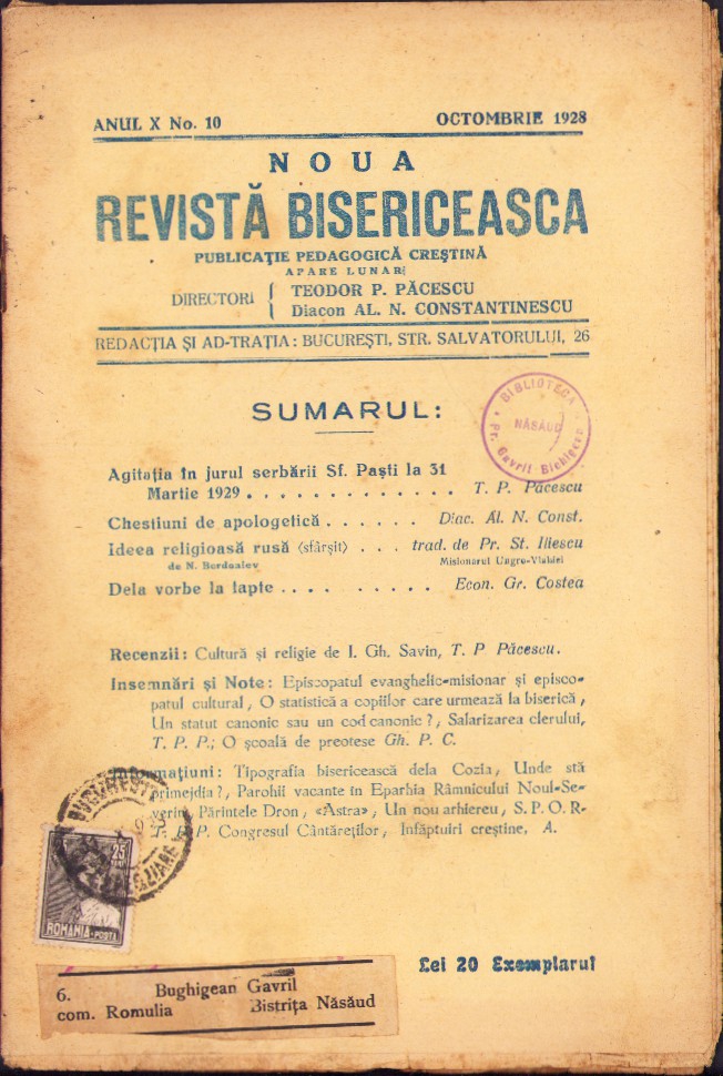 Noua Revistă Bisericească, 10/1928, Tipografia cărților bisericești, București.