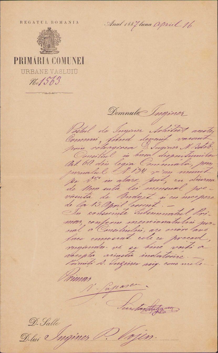 Numire în funcția de inginer al orașului Vaslui semnată olograf de primarul Neron Lupașcu, 1887