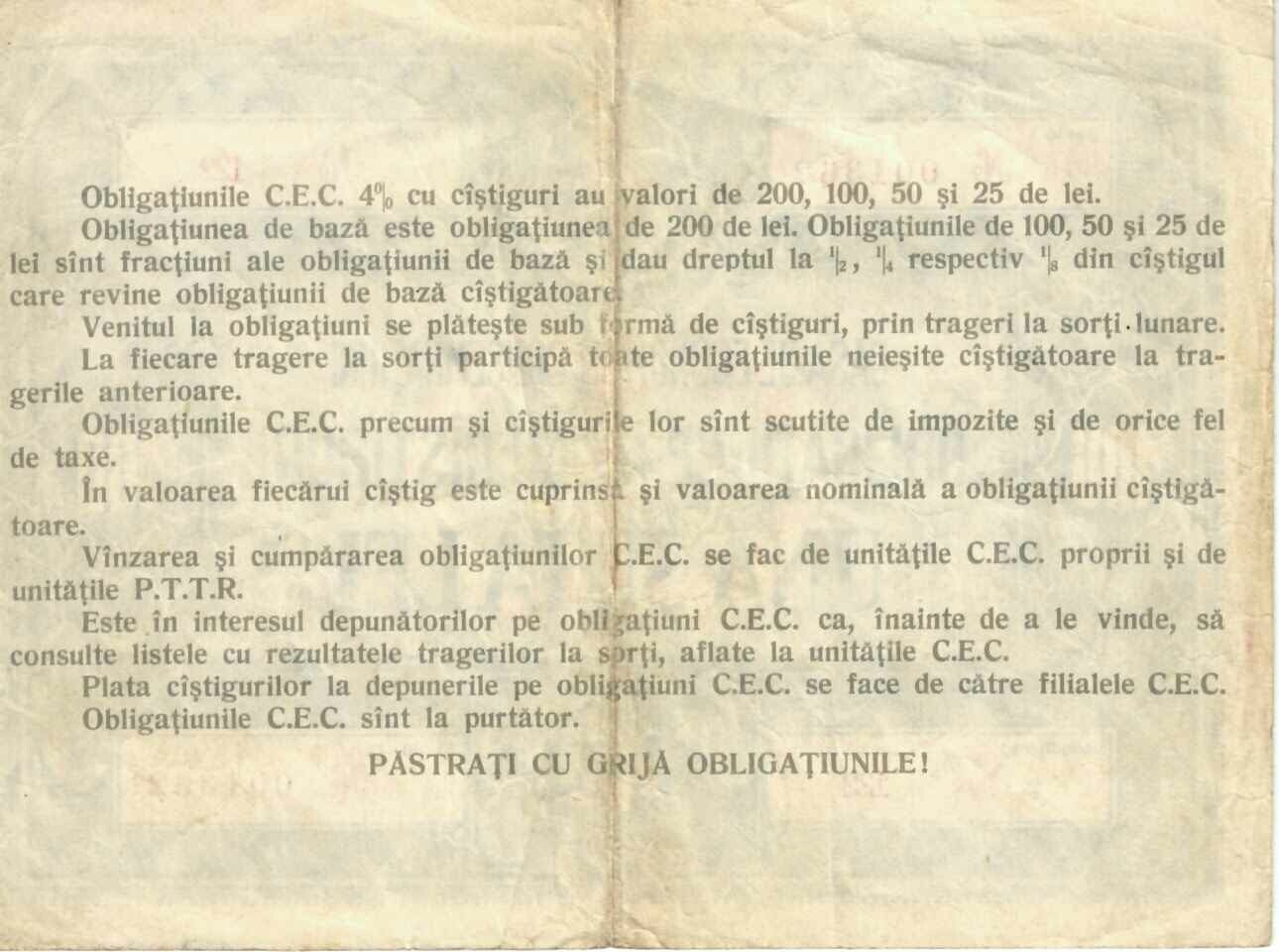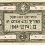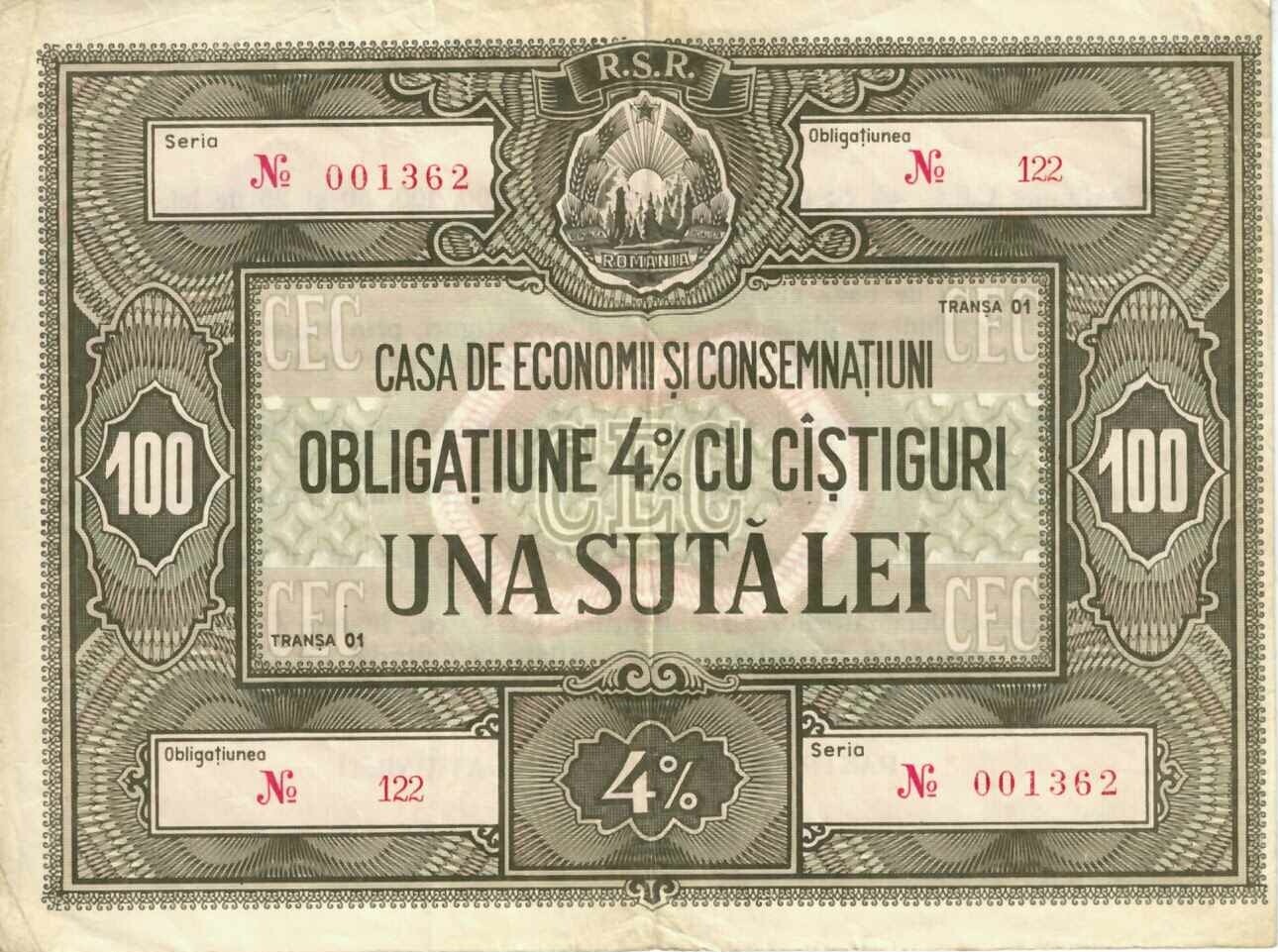 Obligațiune 4% cu câștiguri, una sută lei, CEC, perioada comunistă.