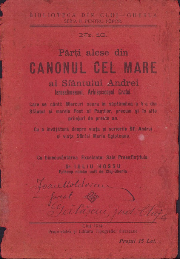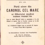 Părți alese din Canonul cel Mare al Sfântului Andrei Ierusalimeanul, Arhiepiscopul Cretei, Care se cântă Miercuri seara în săptămâna a V-a din Sfântul și marele Post al Paștilor, precum și în alte prilejuri de preste an, cu o învățătură despre viața și scrierile Sf Andrei și viața Sfintei Maria Egipteana, cu binecuvântarea Excelenței Sale Preasfințitului Iuliu Hossu Episcop român unit de Cluj-Gherla, 1934, Tipografia Diecezană.
