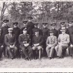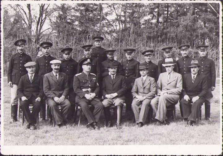 Directorul Hergheliei de Stat și Depozitul de Armăsari de la Bonțida, dr. Petre Spânul, în centrul imaginii, în uniformă a Frontului Renașterii Naționale. Alături de el, personal al hergheliei (pe scaune) și îngrijitorii animalelor (în spate, în picioare). De remarcat uniformele îngrijitorilor.