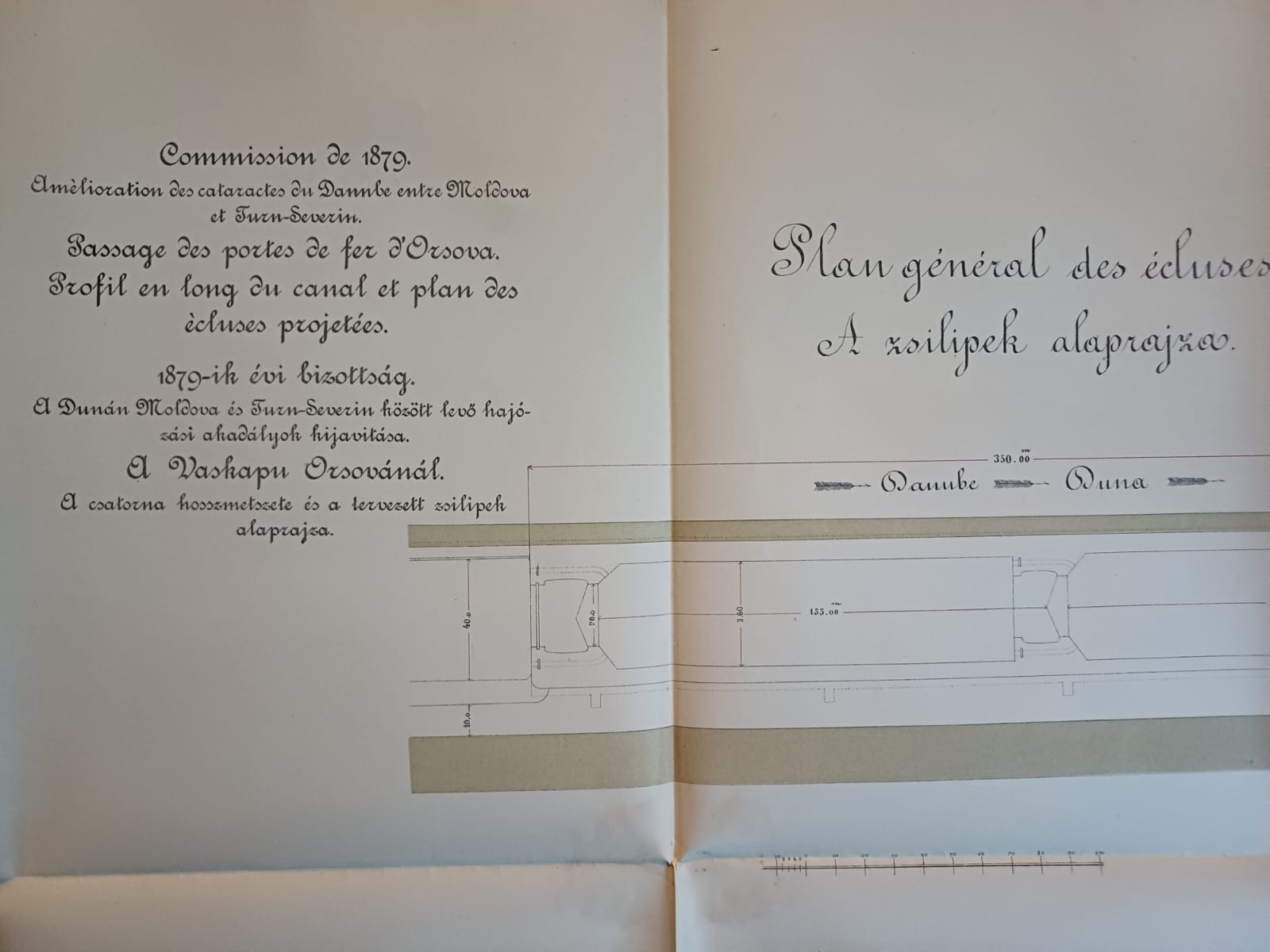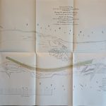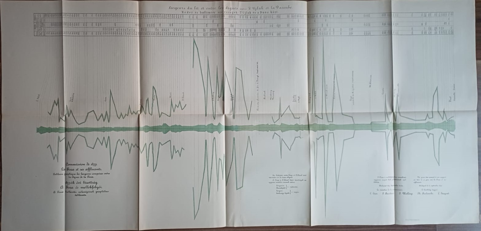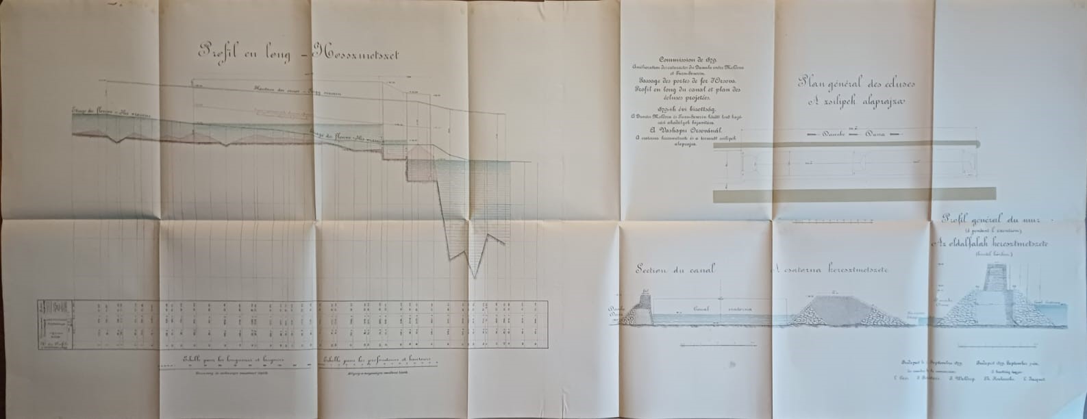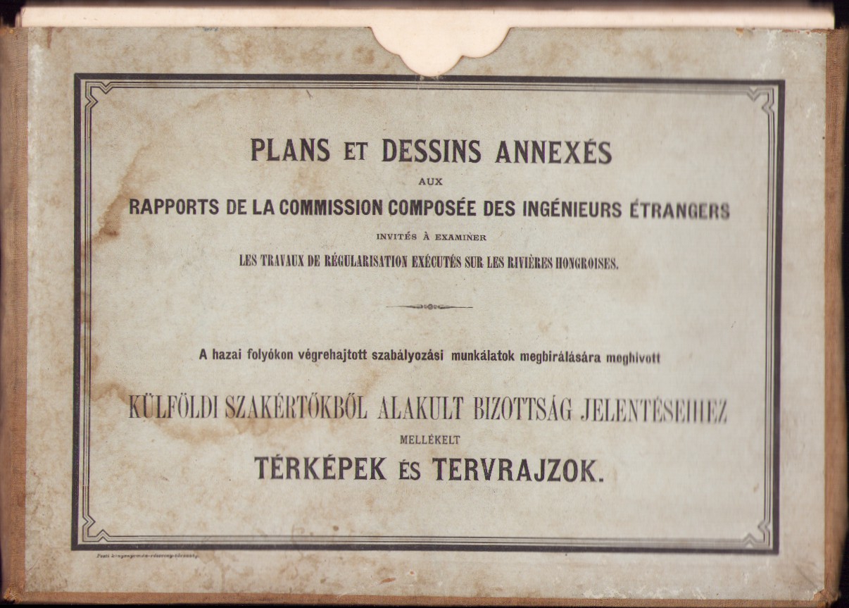 Plans et dessins annexés aux rapports de la commission composée des ingenieurs étrangers invités a examiner les travaux de régularisation exécutés sur les rivierés hongroises, 1879, mapă cu 13 schițe și planuri hidrografice.