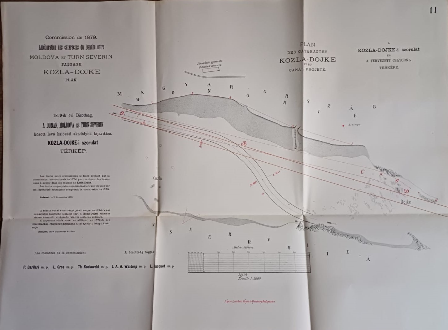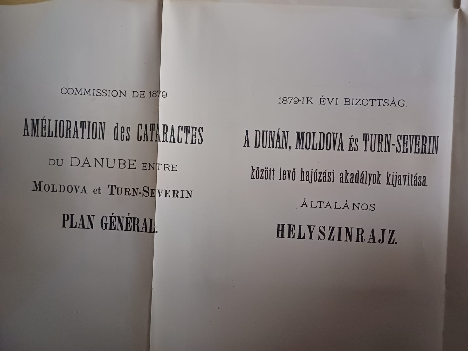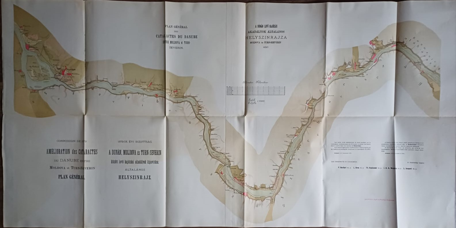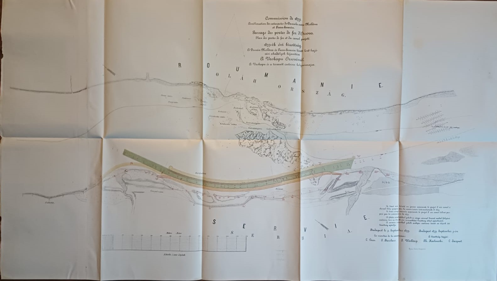 Plans et dessins annexés aux rapports de la commission composée des ingenieurs étrangers invités a examiner les travaux de régularisation exécutés sur les rivierés hongroises, 1879, mapă cu 13 schițe și planuri hidrografice.