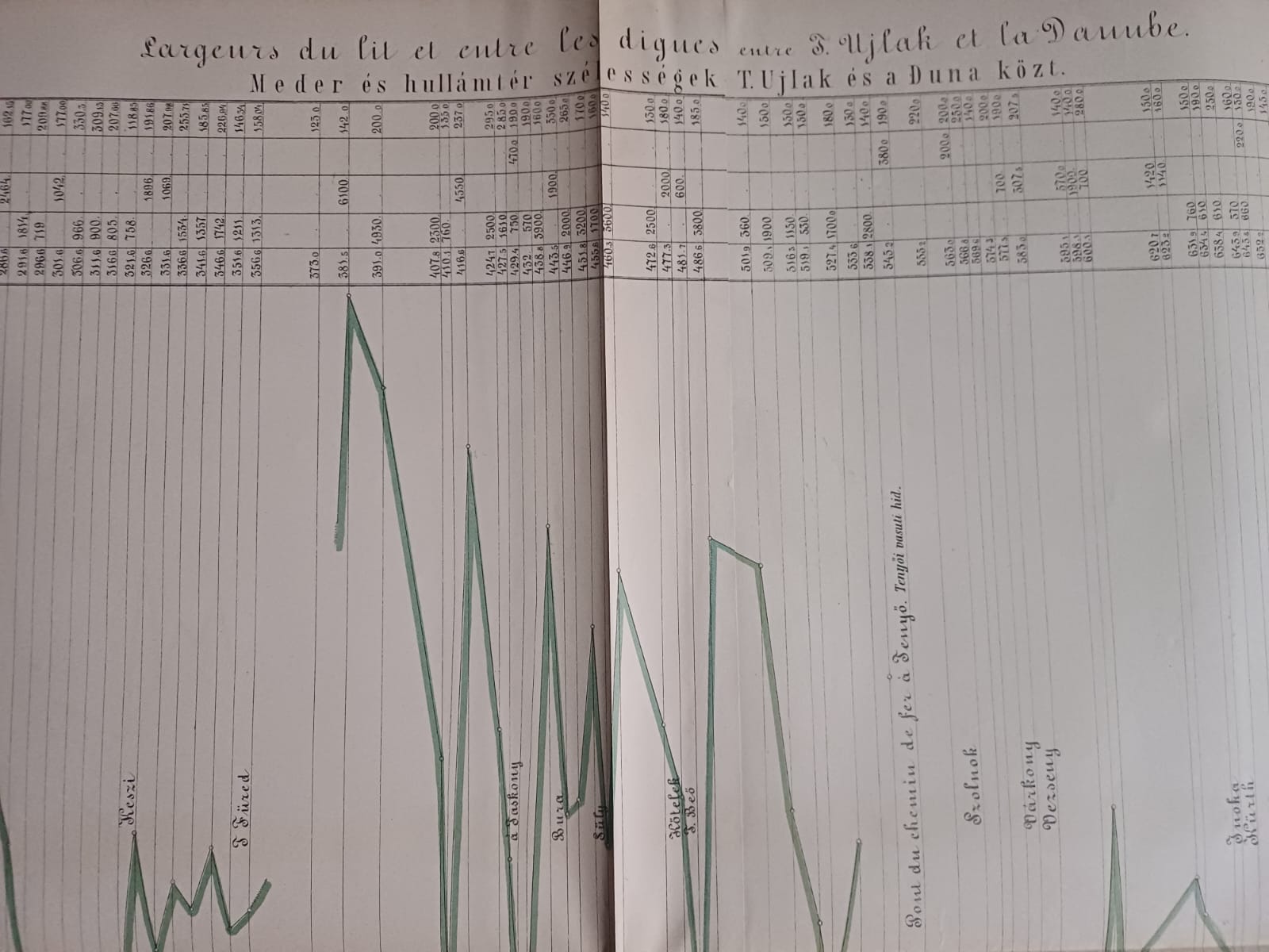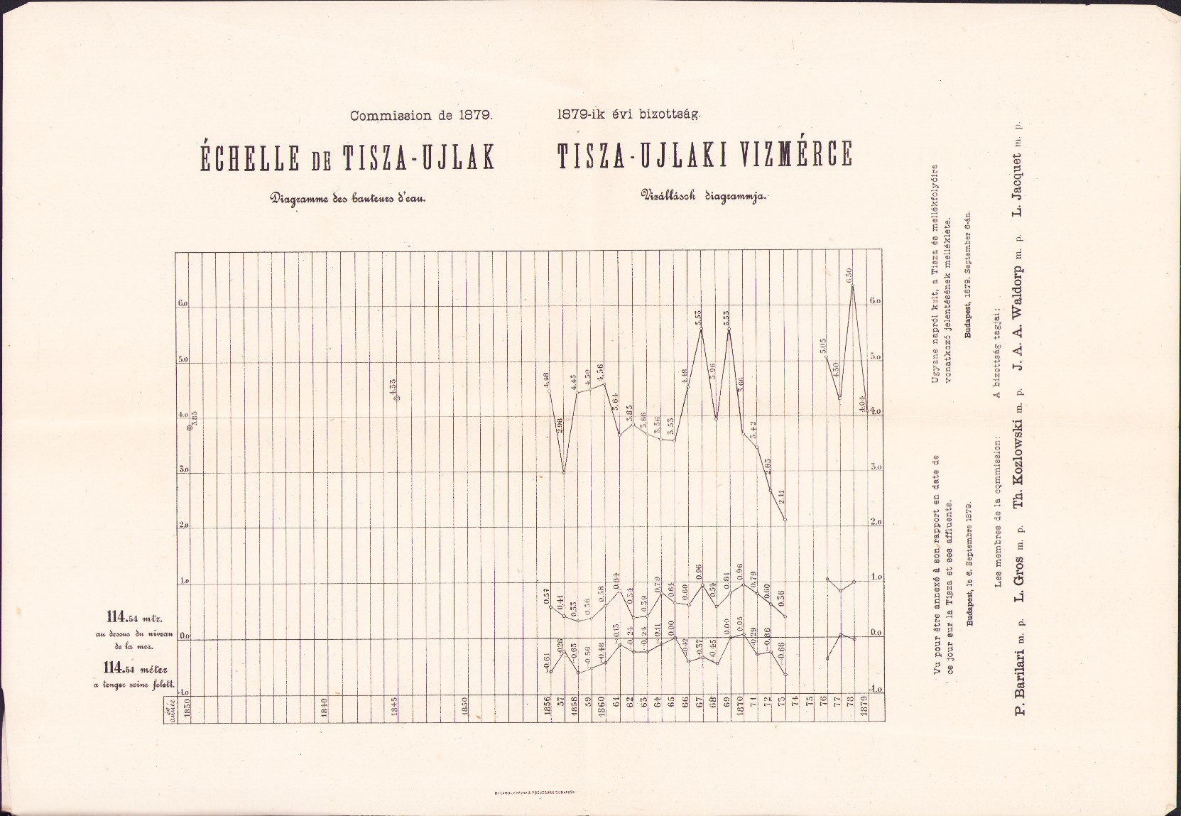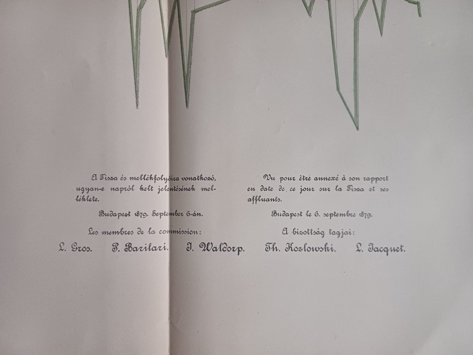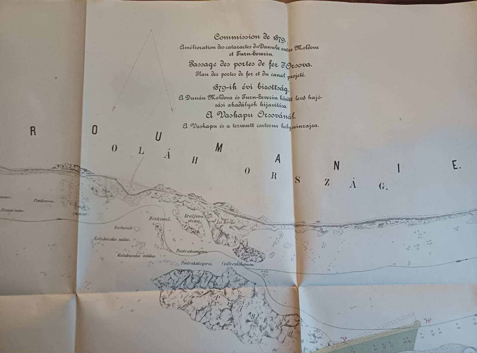 Plans et dessins annexés aux rapports de la commission composée des ingenieurs étrangers invités a examiner les travaux de régularisation exécutés sur les rivierés hongroises, 1879, mapă cu 13 schițe și planuri hidrografice.