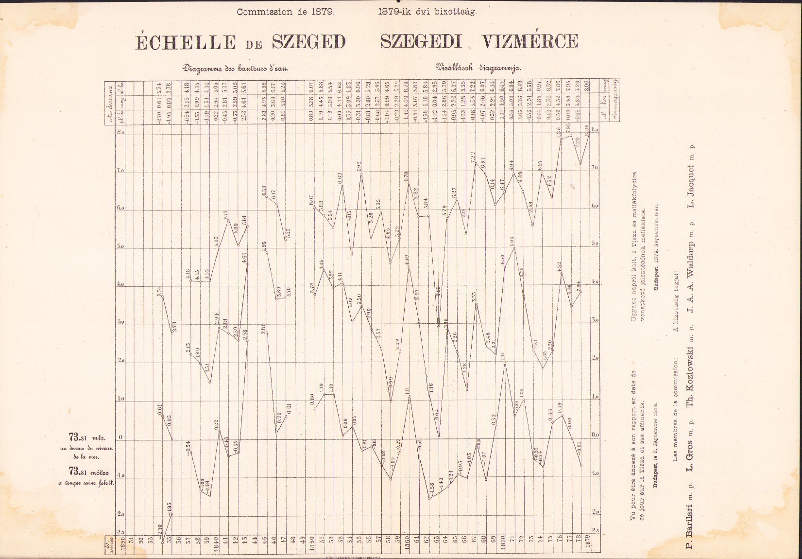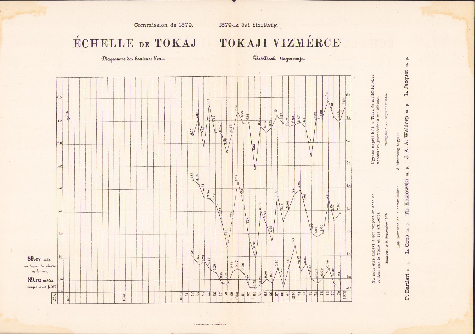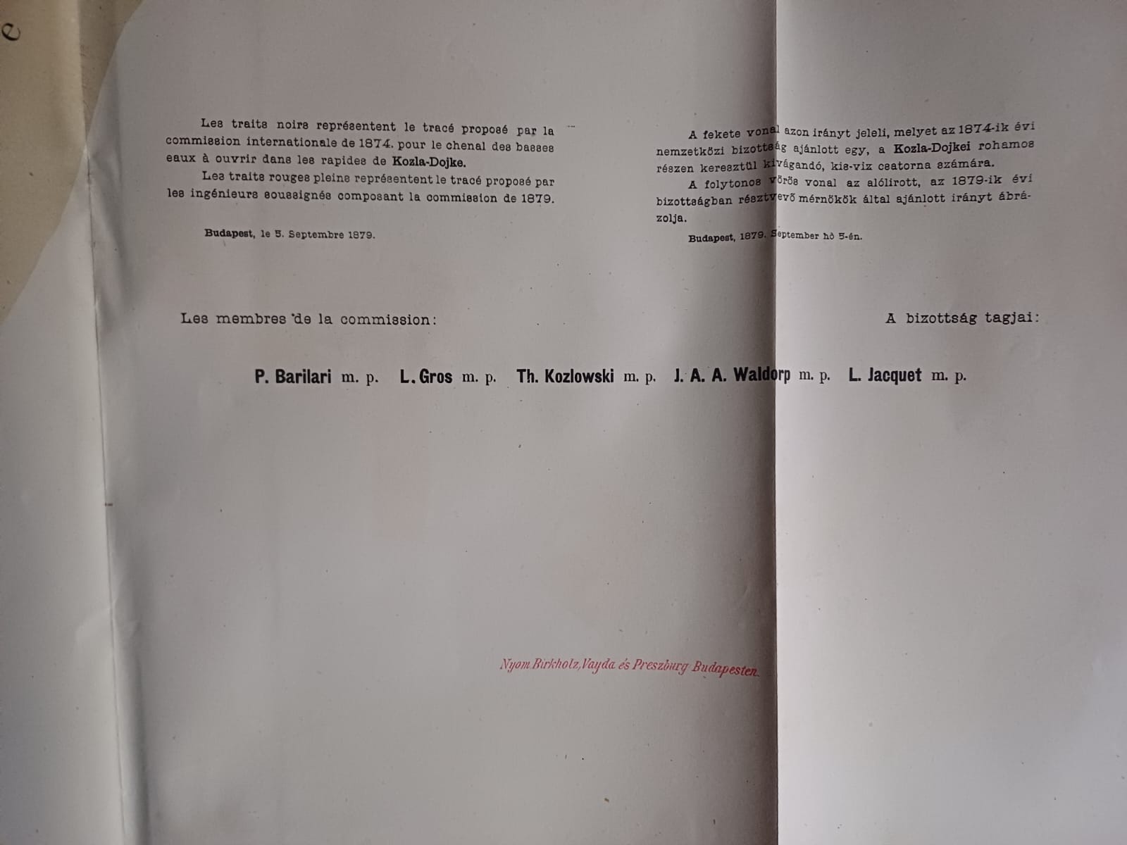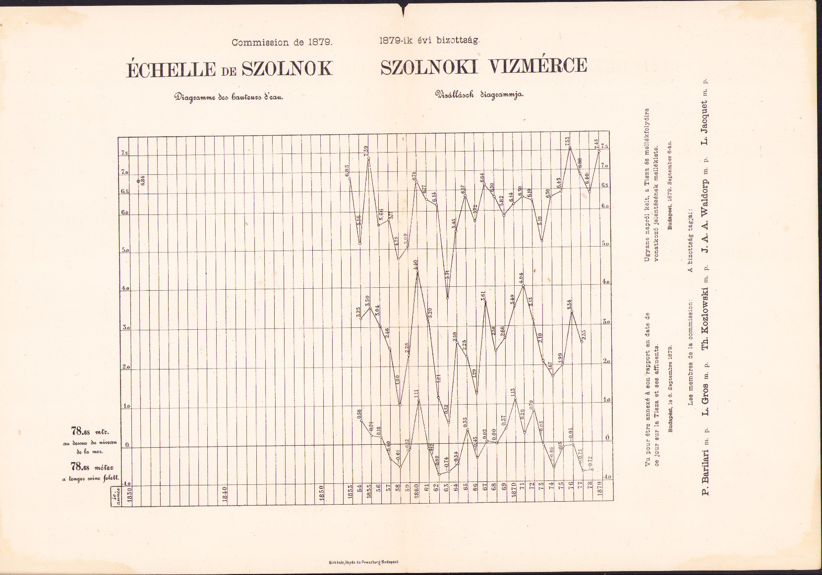 Plans et dessins annexés aux rapports de la commission composée des ingenieurs étrangers invités a examiner les travaux de régularisation exécutés sur les rivierés hongroises, 1879, mapă cu 13 schițe și planuri hidrografice.