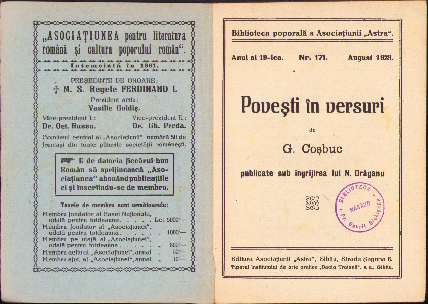 Povești în versuri de George Coșbuc publicate sub îngrijirea lui N Drăganu, 1929, Biblioteca poporală a Asociațiunii.