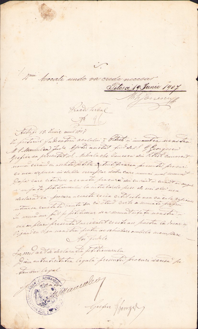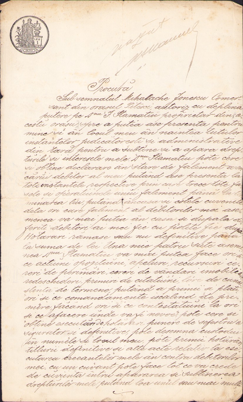 Procură a comerciantului Mihalache Ionescu din Pitești pentru reprezentare în fața instanțelor judecătorești de către alt comerciant din oraș, 1907, Pitești.