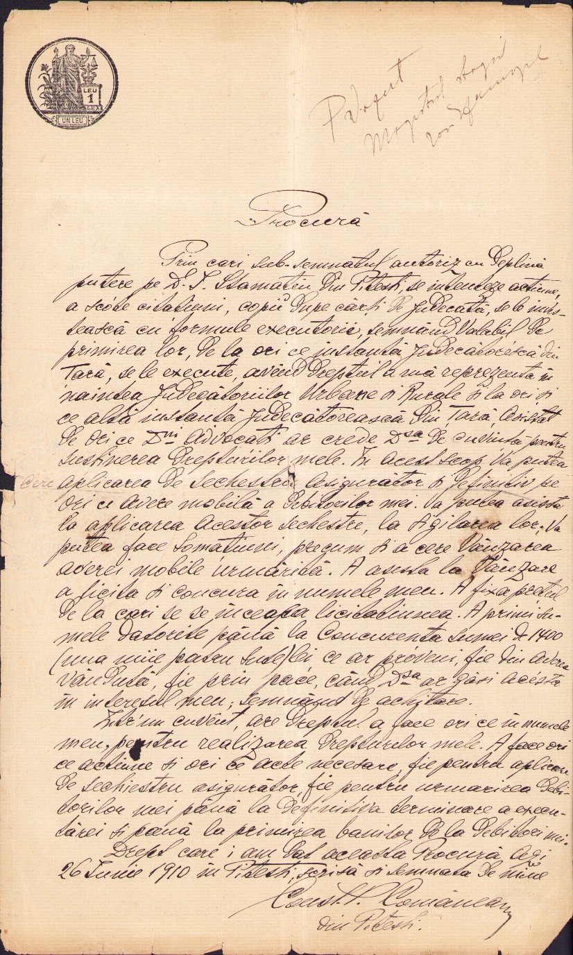 Procură pentru reprezentare în fața instanțelor judecătorești, 1910, Pitești.