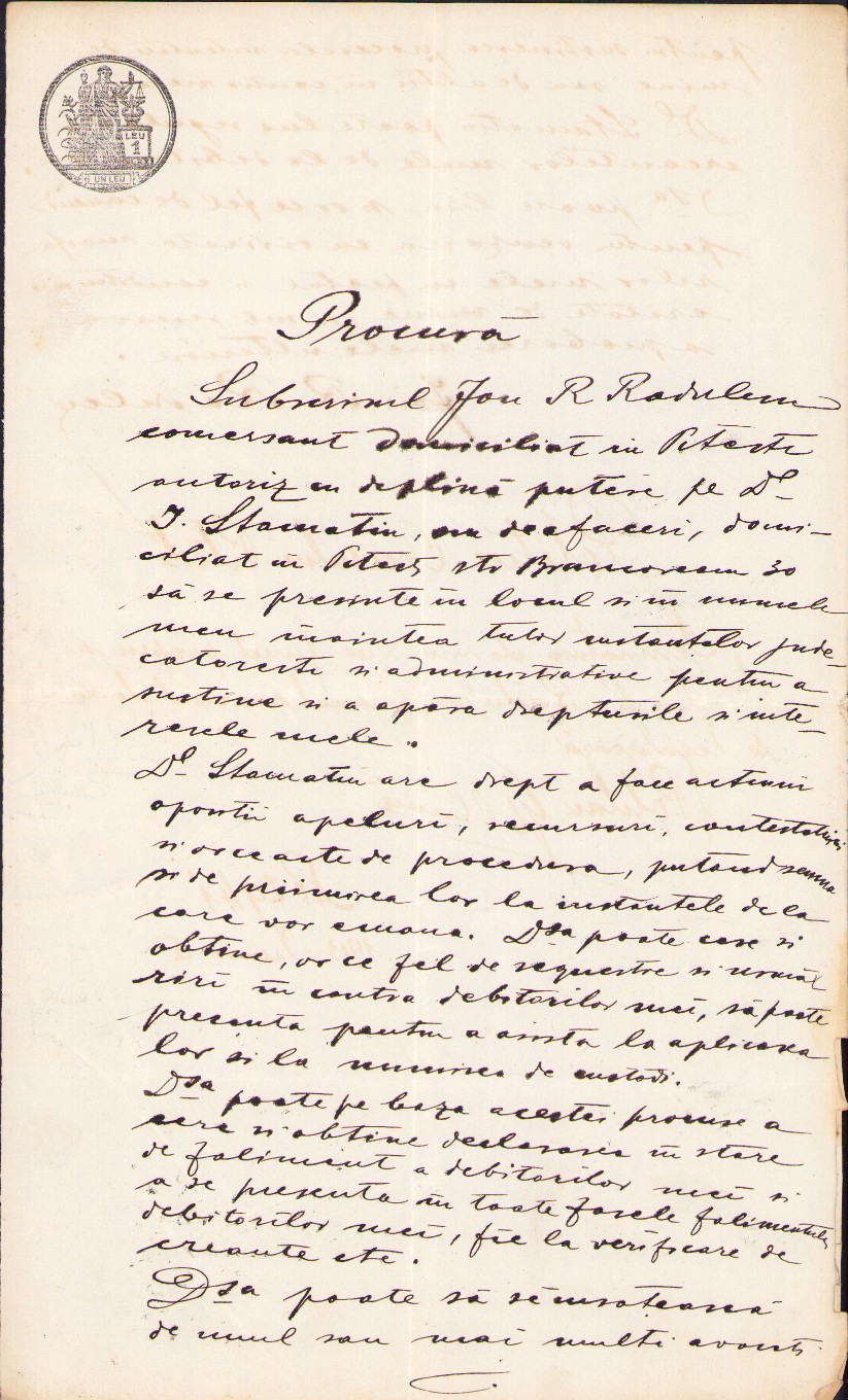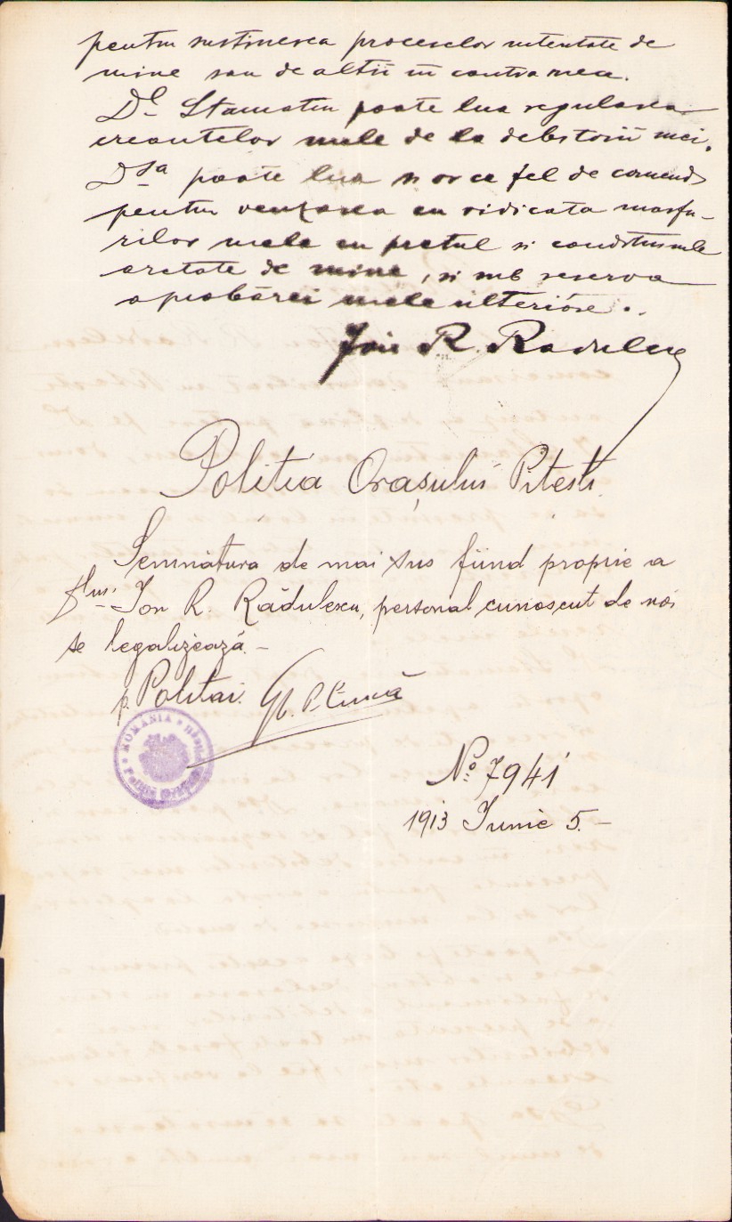 Procură pentru reprezentare în fața instanțelor judecătorești și declarare a falimentului debitorilor, 1913, Pitești, legalizată de poliția orașului.