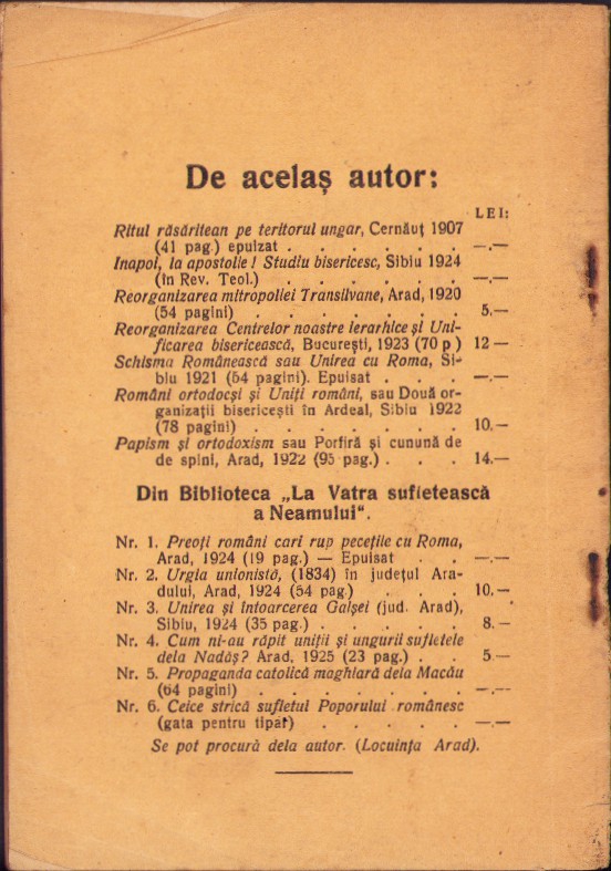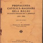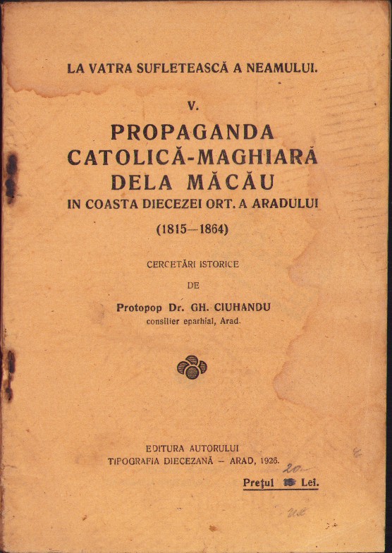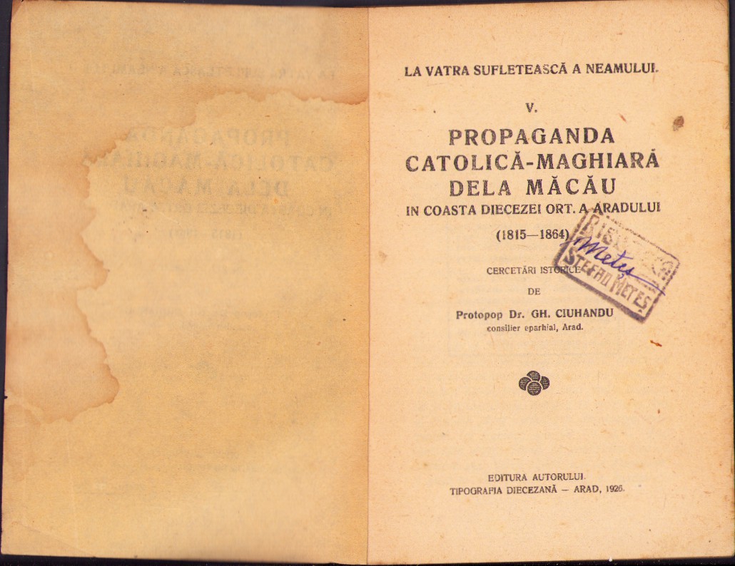 Propaganda catolică-maghiară dela Măcău în coasta diecezei ort a Aradului, cercetări istorice de protopop dr Gheorghe Ciuhandu, 1925, Tipografia diecezană, Arad, cu semnătura olografă a lui Ștefan Meteș și ex-libris-ul său.