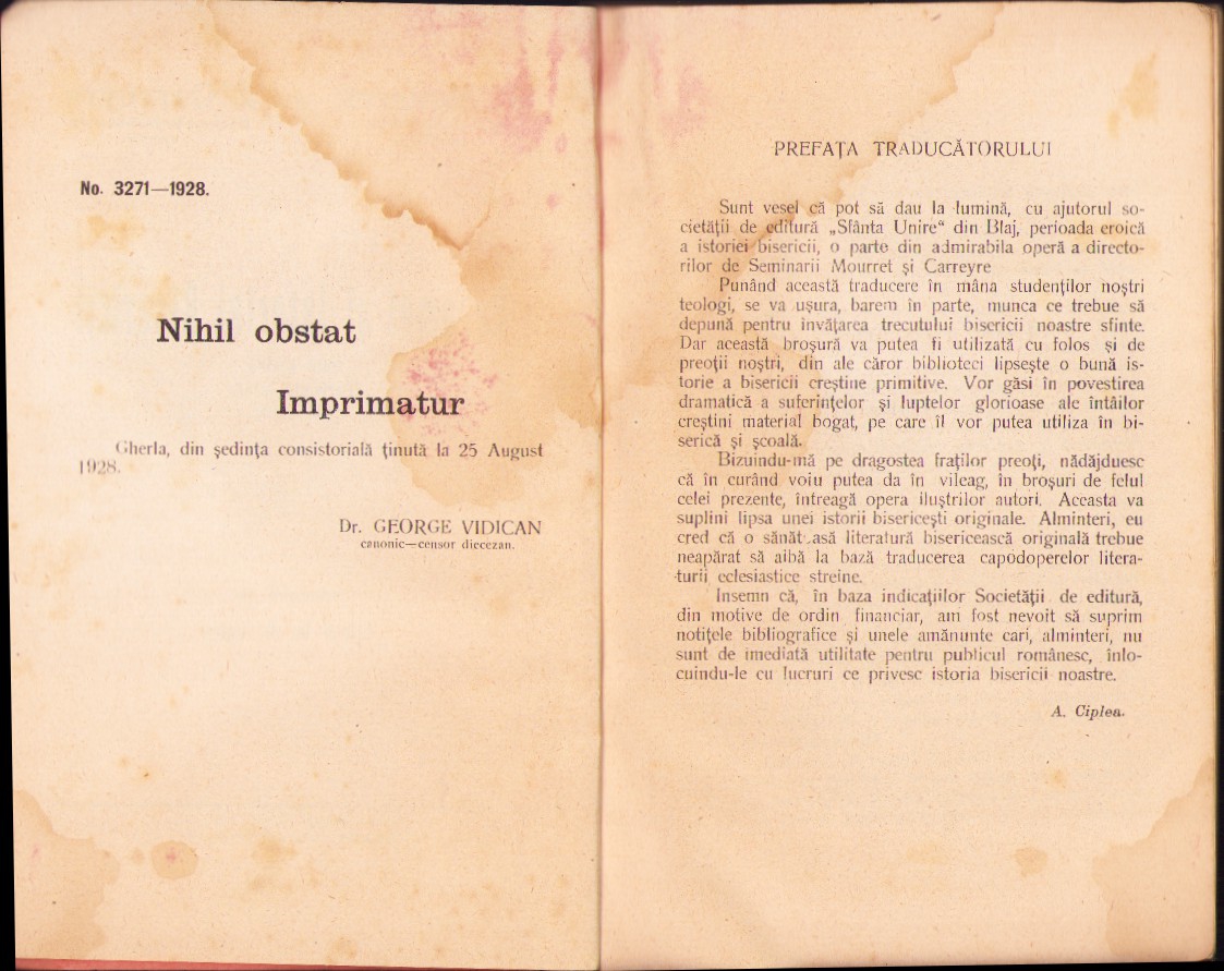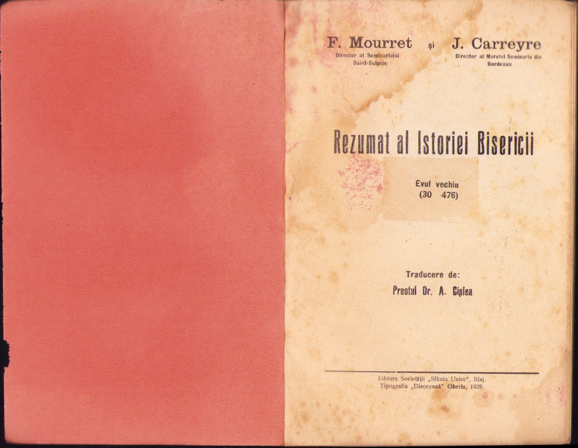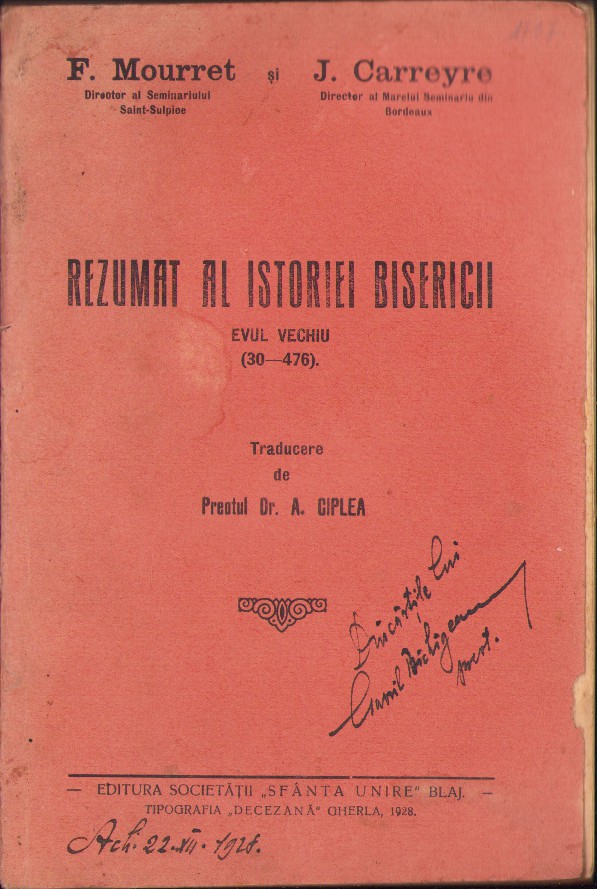 Rezumat al istoriei bisericii, Evul Mediu (30-480) de F Mourret și J Carreyre, traducere de preot dr A Ciplea, 1928, Blaj.