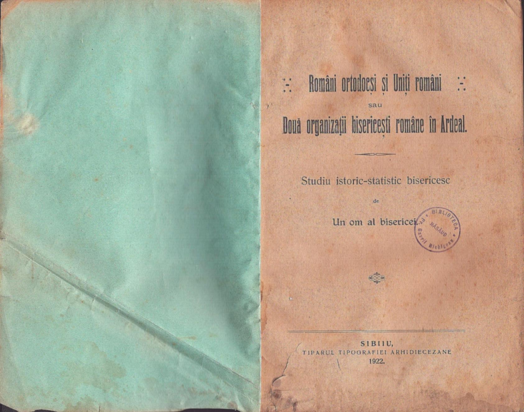 Români ortodocși și Uniți români sau două organizații bisericești române în Ardeal, studiu istorico-statistic bisericesc de un om al bisericei, 1922, Sibiu.
