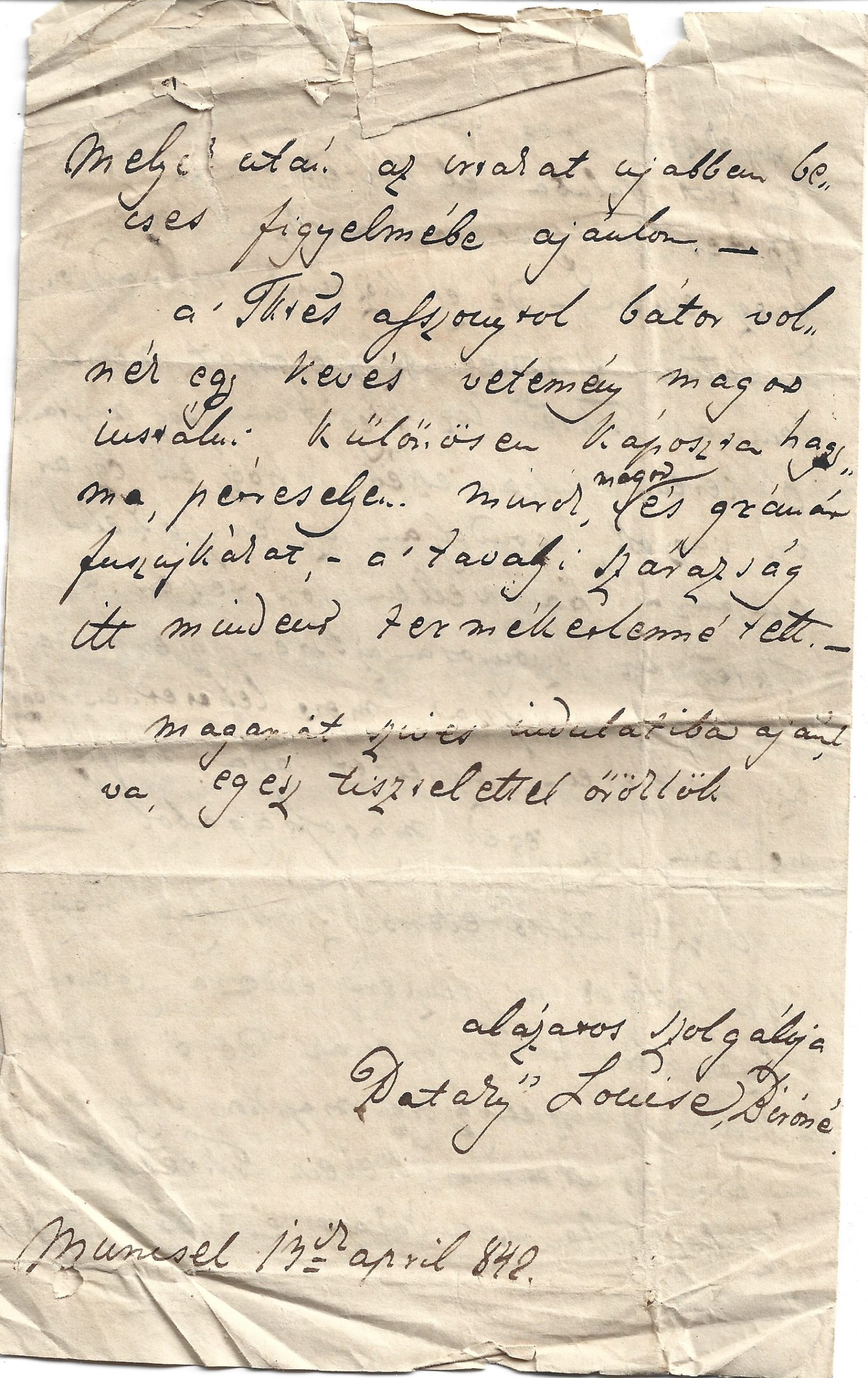 Scrisoare a contesei Pataky Louise din Muncelu, varmeghia Alba, 1842, către un solgabirău din Târgu Lăpuș, în chestiunea vânzării proprietăților din Târgu Lăpuș ale contesei.