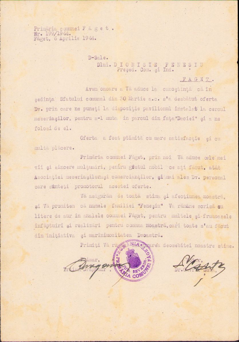 Scrisoare de mulțumire adresată de Primăria Făget, județul Timiș, lui Dionisie Feneșiu (în 1918 bărbat de încredere al Consiliului Național Român din Făget), pentru că a pus la dispoziție un pavilion pentru refugiații români veniți de la Iași în primăvara anului 1944. Semnată olograf de primarul localității, Traian Dragomir.