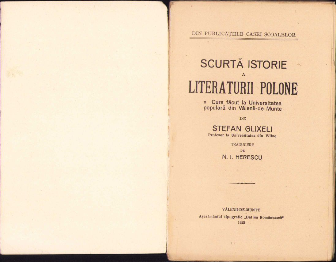 Scurtă istorie a literaturii polone de Stefan Glixeli, 1925, Așezământul tipografic Datina Românească, Vălenii de Munte.