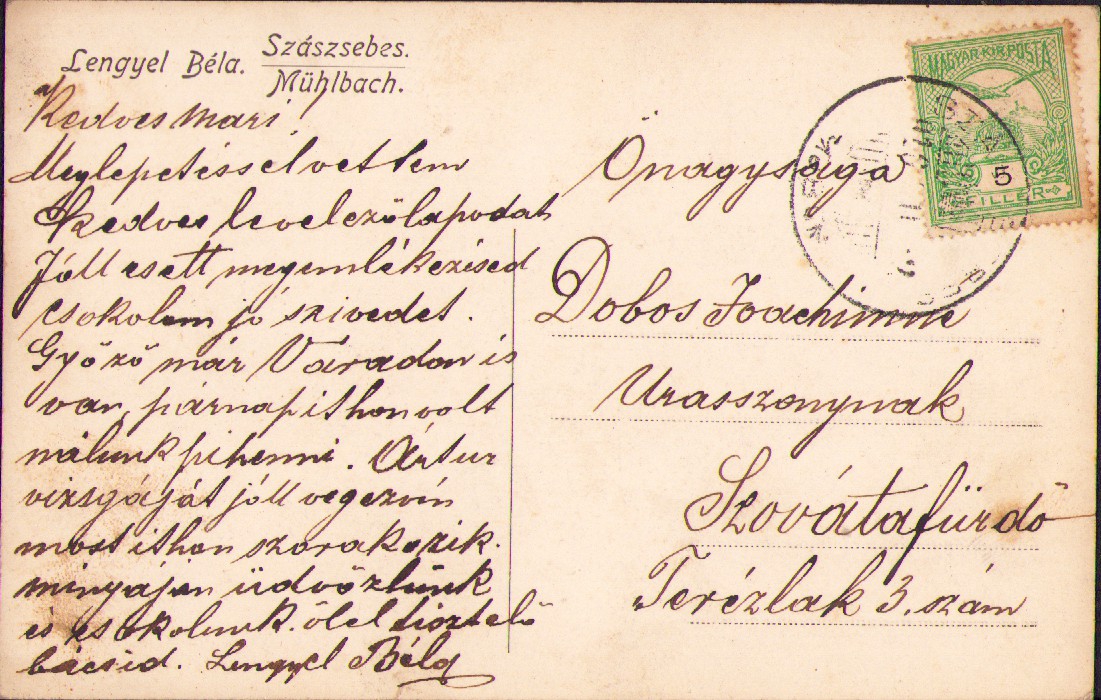 Sebeș Hotel Lengyel Béla Szálloda, carte poștală, circulată Băile Sovata.