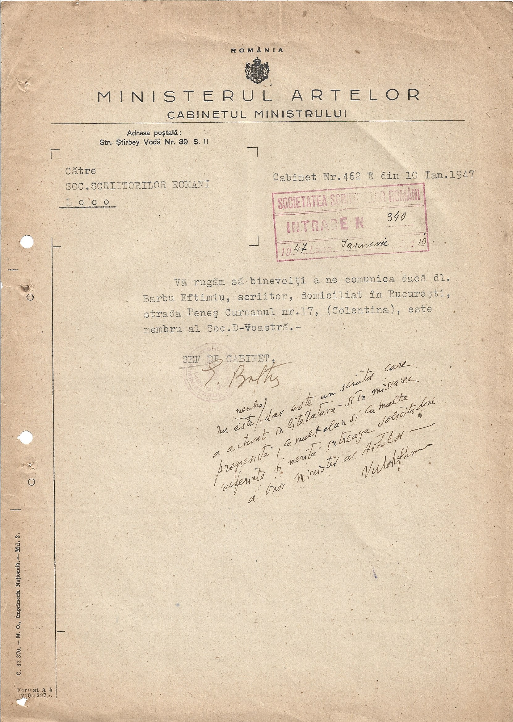 Semnătura olografă a lui Victor Eftimiu, 1947