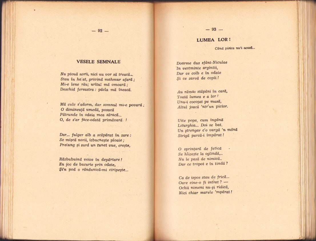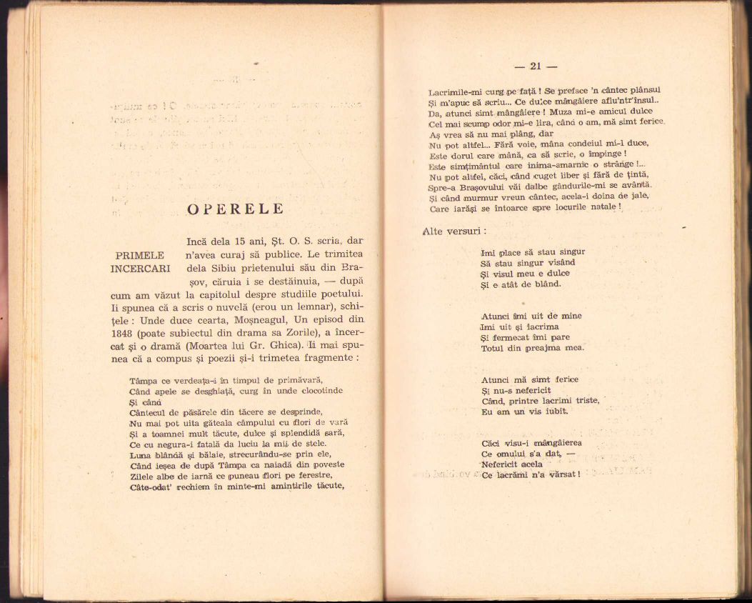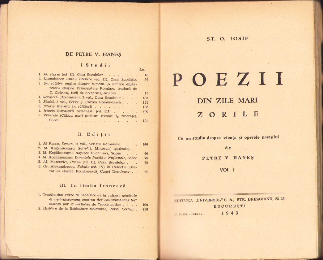 Șt O Iosif, Poezii din zile mari, Zorile, cu un studiu despre vieața și operele poetului de Petre V Haneș, 1943, volumul I, Editura Universul, București.
