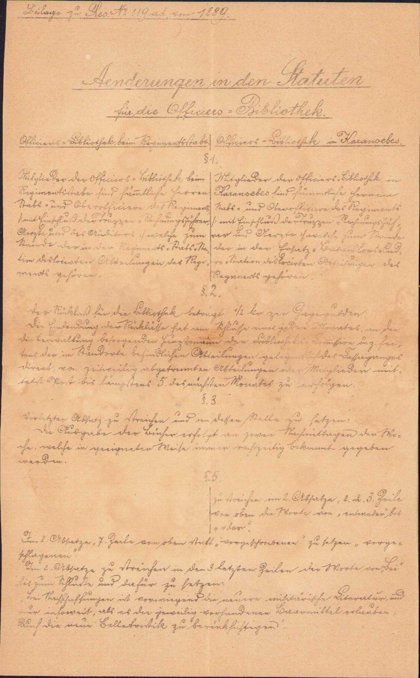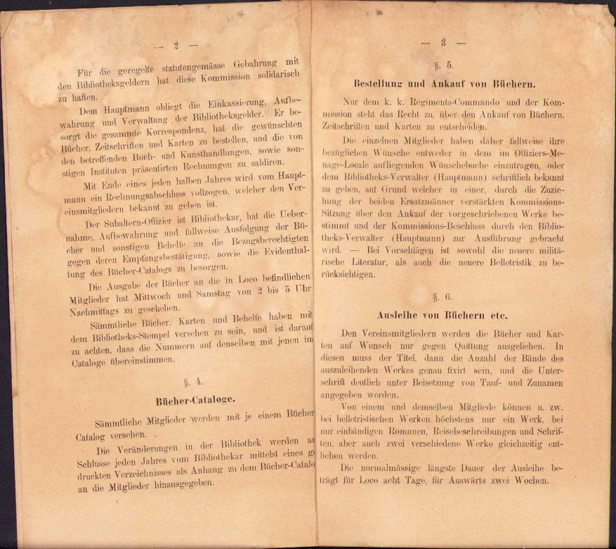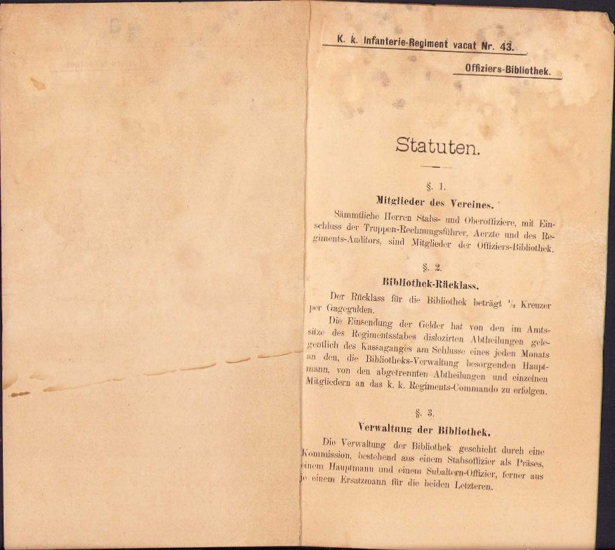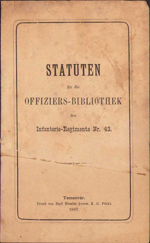 Statuten für die Offiziers-Bibliotek des Infanterie-Regiments Nr. 43 – Statutele bibliotecii ofițerilor Regimentului 43 Infanterie, 1887, Timișoara, Tipografia lui Emil Hössler