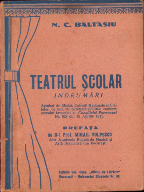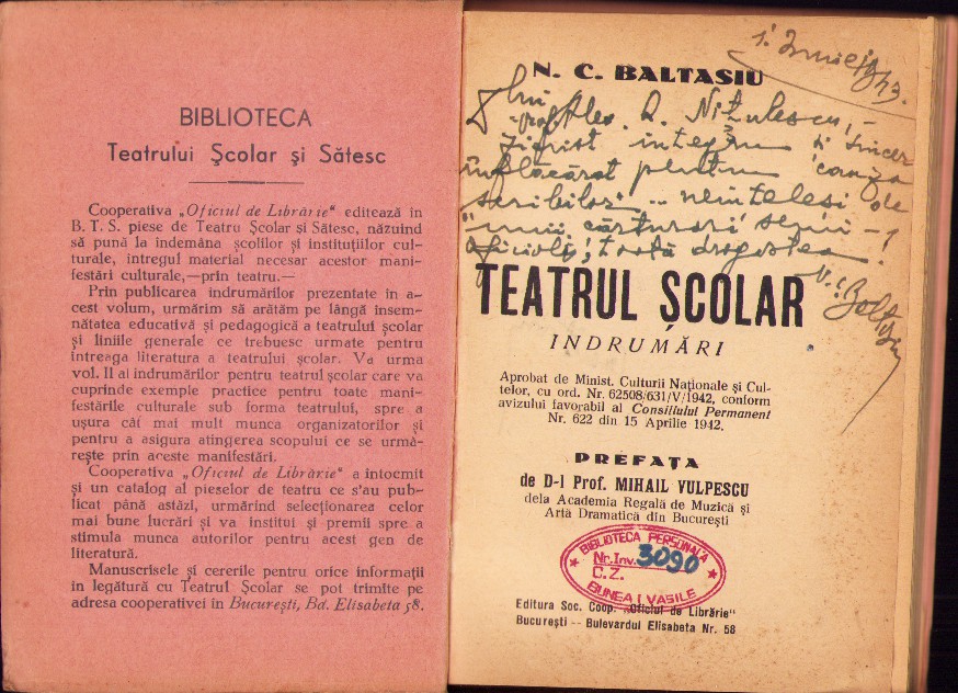 Teatrul școlar. Îndrumări de N. C. Baltasiu, 1942, cu dedicația olografă a autorului.