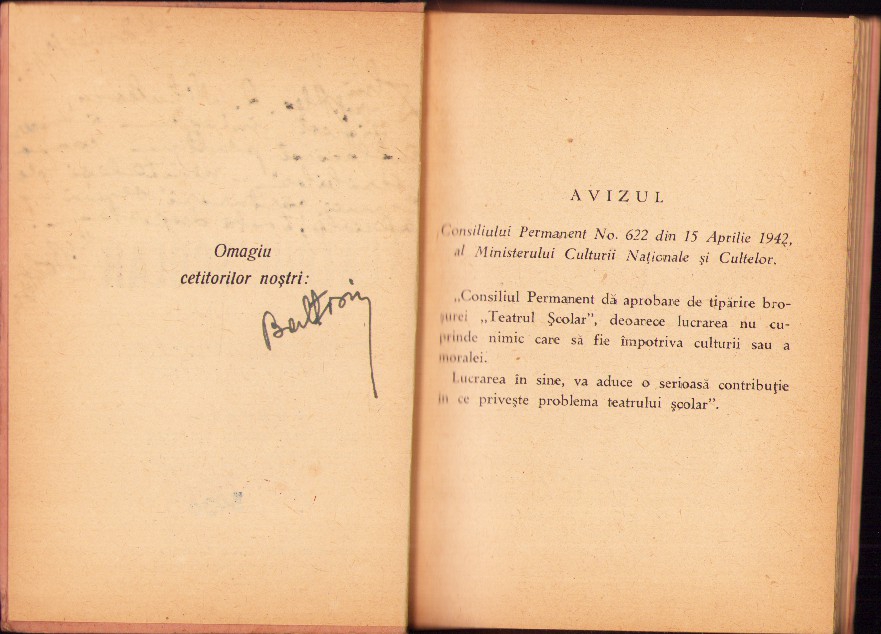 / Teatrul școlar. Îndrumări de N. C. Baltasiu, 1942, cu dedicația olografă a autorului