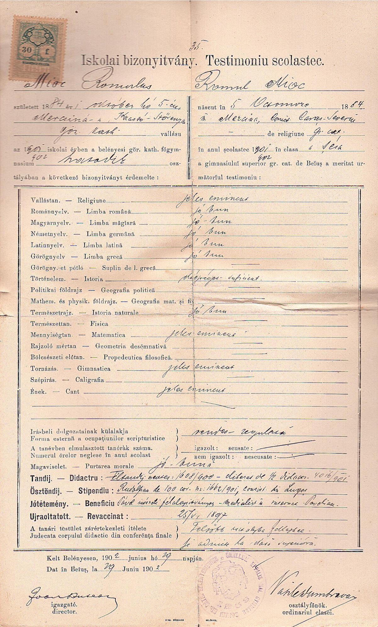 Testimoniu scolastic al lui Romulus Mioc (viitor primar al Petroșanilor și prefect al județului Hunedoara), 1902, eliberat de Gimnaziul român greco-catolic din Beiuș.