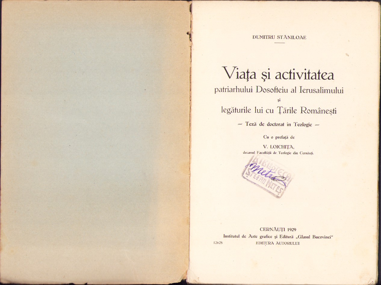 Teza de doctorat a celui mai mare teolog român al secolului al XX-lea și unul dintre cei mai importanți teologi ortodocși europeni, Dumitru Stăniloae, Viața și activitatea patriarhului Dosofteiu al Ierusalimului și legăturile lui cu Țările Românești, cu o prefață de V Loichița, decan, cu semnătura olografă a lui Ștefan Meteș și ex-libris-ul său, 1929, Cernăuți, editura autorului.