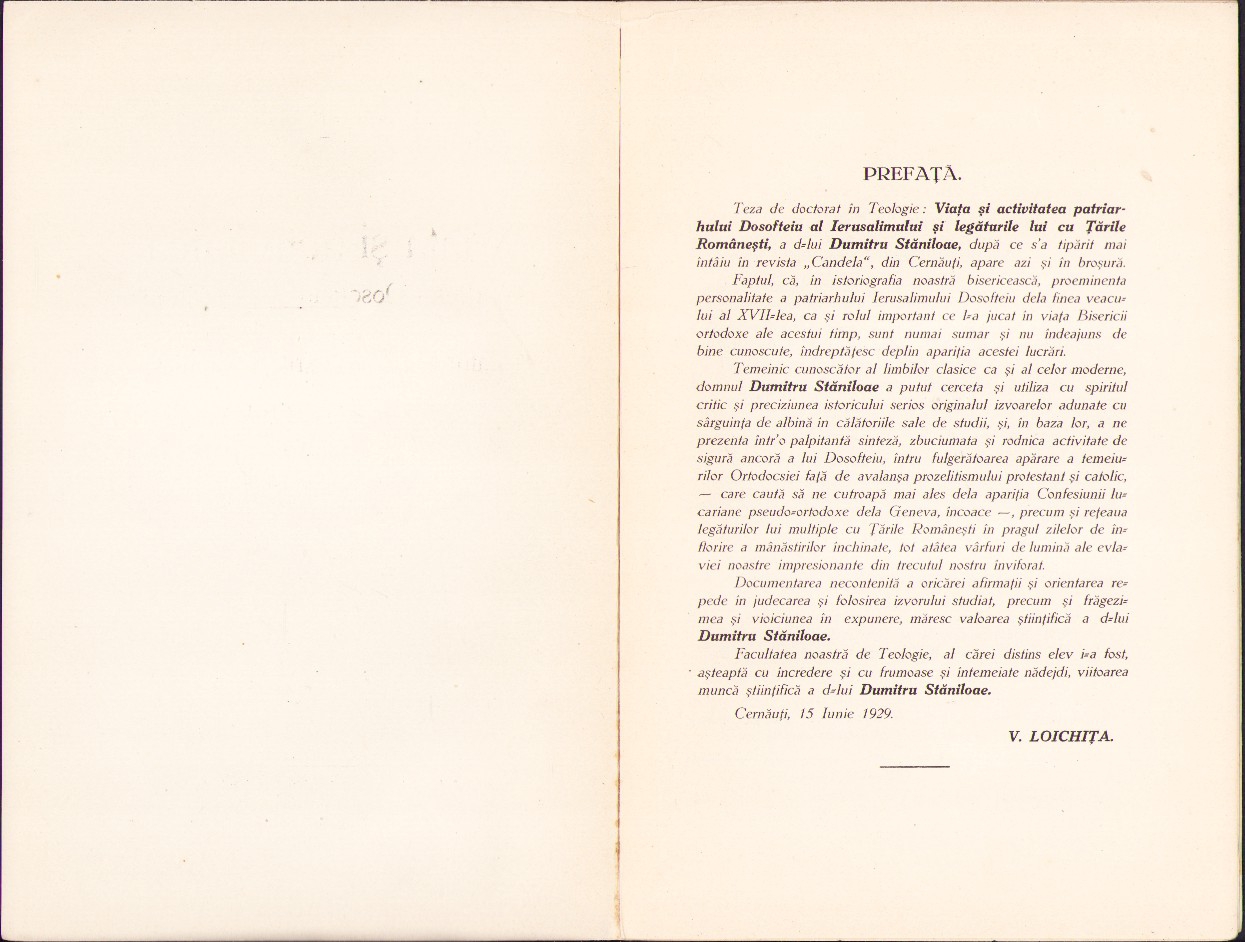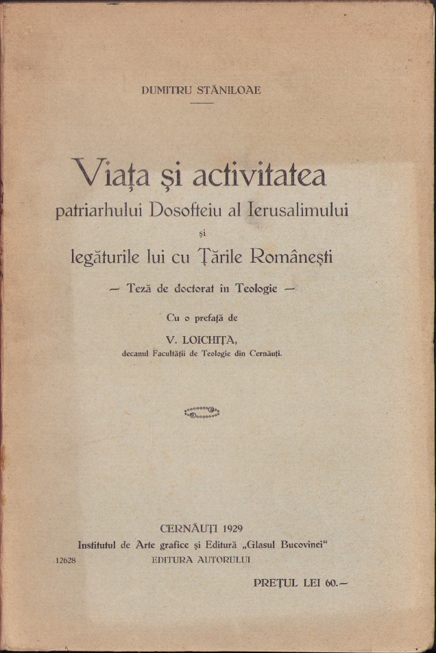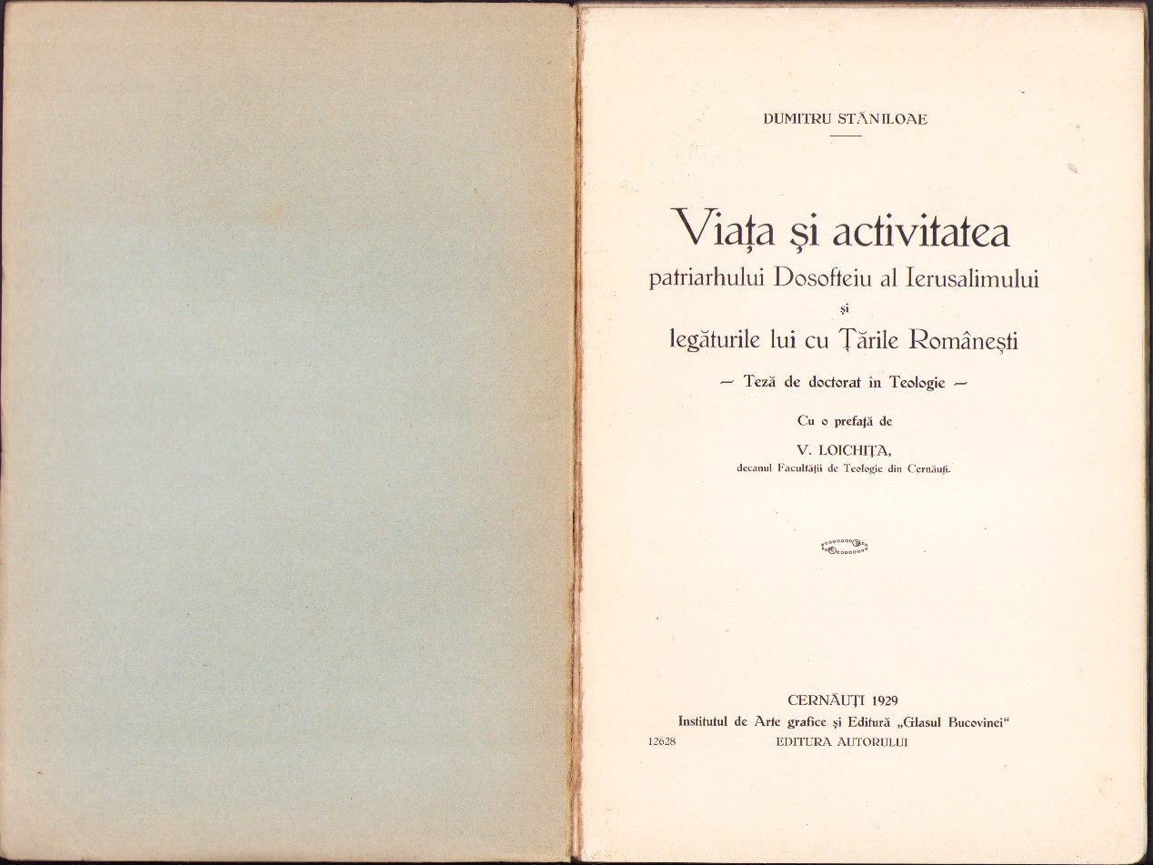 Teza de doctorat a celui mai mare teolog român al secolului al XX-lea și unul dintre cei mai importanți teologi ortodocși europeni, Dumitru Stăniloae, Viața și activitatea patriarhului Dosofteiu al Ierusalimului și legăturile lui cu Țările Românești, cu o prefață de V Loichița, decan, 1929, Cernăuți, editura autorului.
